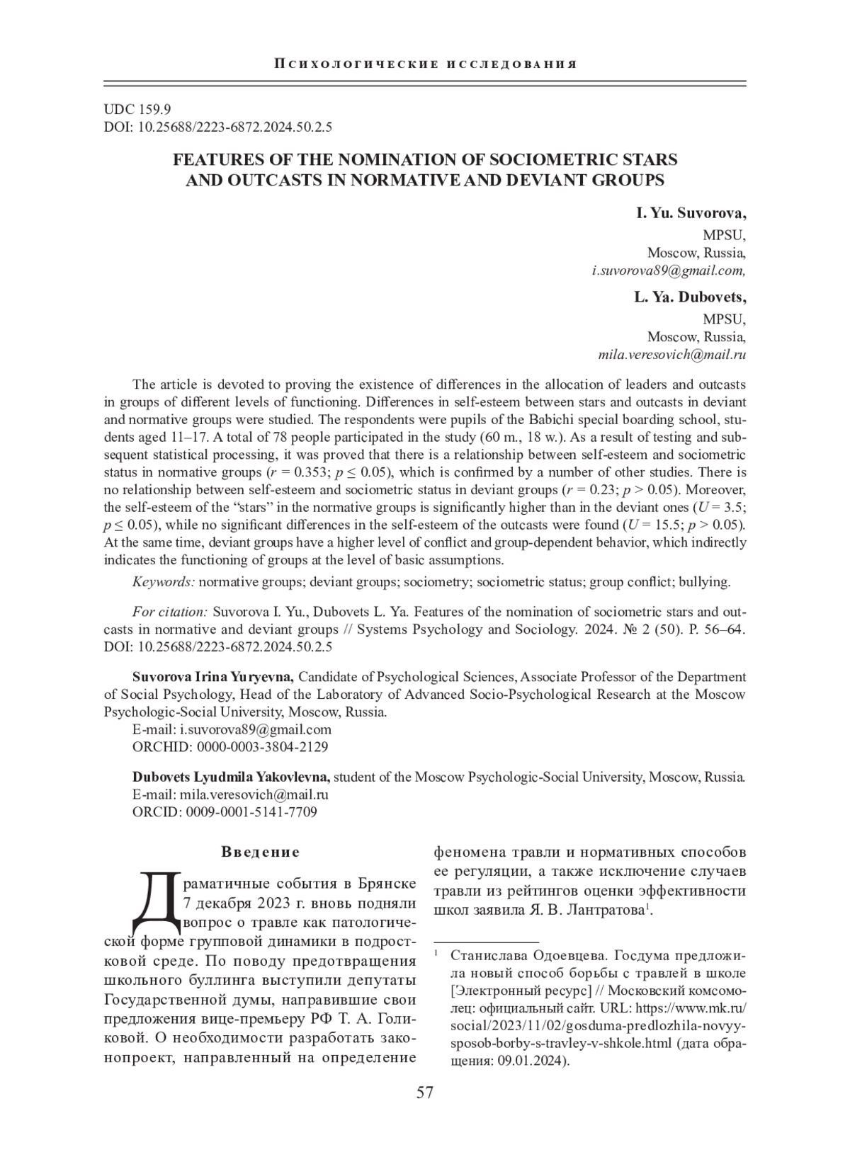 Статья посвящена доказательству существования различий в выделении лидеров и изгоев в группах разного уровня функционирования. Исследовались различия в самооценке у звезд и изгоев в девиантных и нормативных группах. Респондентами выступили воспитанники Бабичской специальной школы-интерната, обучающиеся 11-17 лет. Всего в исследовании приняли участие 78 человек (60 мальчиков, 18 девочек). В результате тестирования и последующей статистической обработки было доказано, что существует взаимосвязь между самооценкой и социометрическим статусом в нормативных группах ( r = 0,353; p ≤ 0,05), что подтверждается рядом других исследований. Взаимосвязь между самооценкой и социометрическим статусом в девиантных группах отсутствует ( r = 0,23; p > 0,05). Более того, самооценк а звезд в нормативных группах достоверно выше, чем в девиантных ( U = 3,5; p ≤ 0,05), тогда как существенных различий в самооценке изгоев не обнаружено ( U = 15,5; p > 0,05). Вместе с тем в девиантных группах выше уровень конфликтности и зависимого от группы поведения, что косвенно указывает на функционирование групп на уровне базовых допущений.