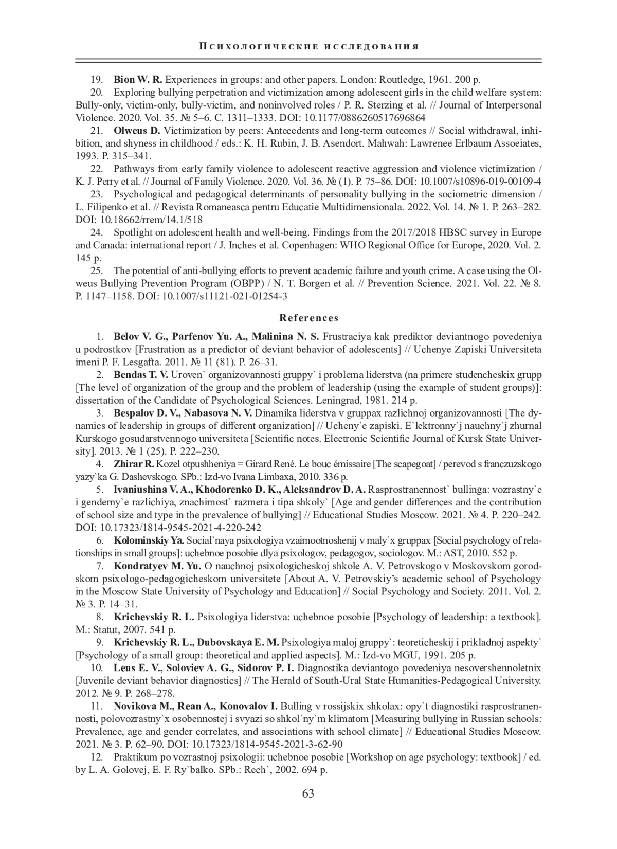 11. Новикова М., Реан А., Коновалов И. Буллинг в российских школах: опыт диагностики распрост раненности, половозрастных особенностей и связи со школьным климатом // Вопросы образования. 2021. № 3. С. 62-90. DOI: 10.17323/1814-9545-2021-3-62-90 EDN: UAIWHS