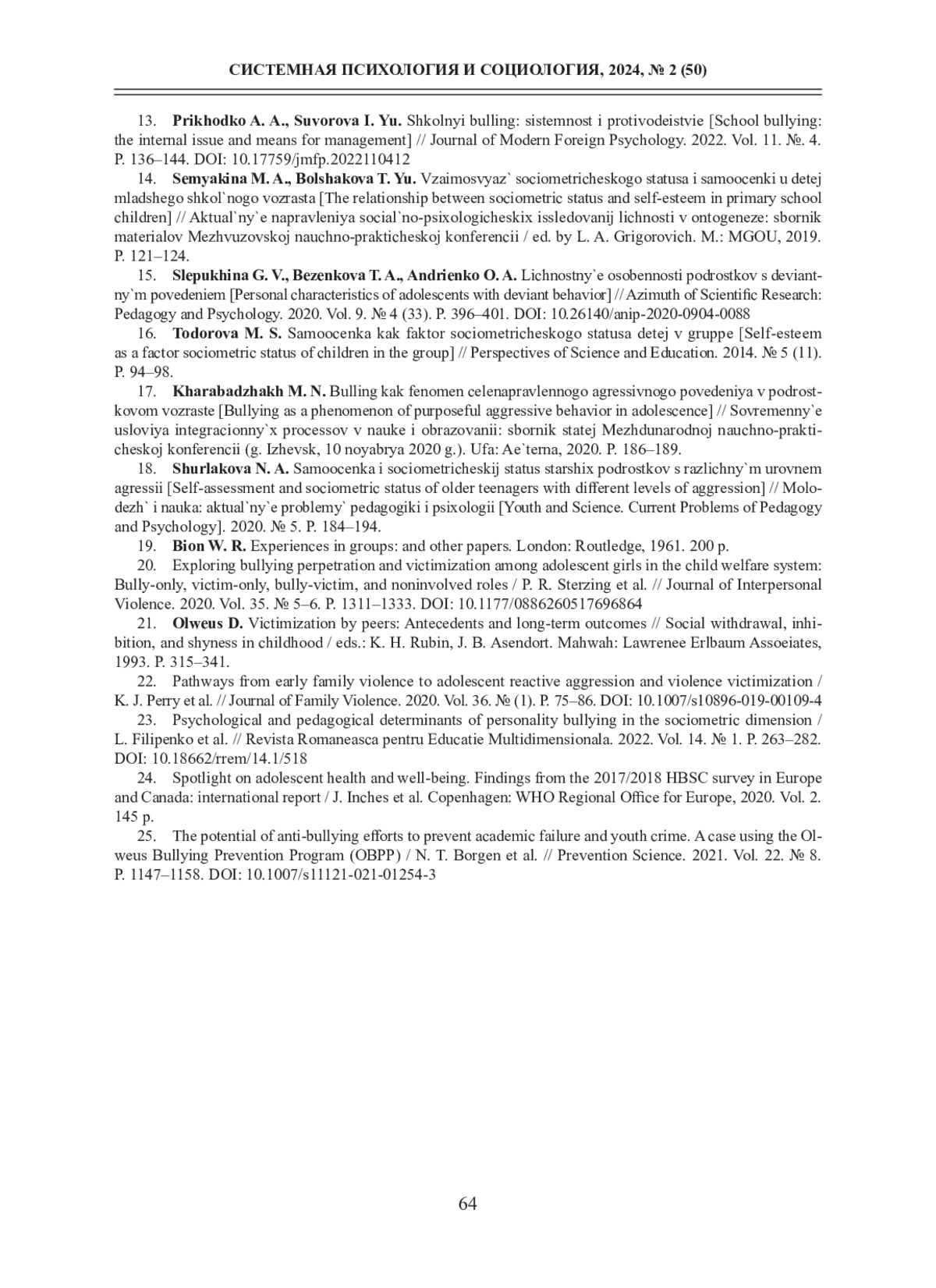 13. Приходько А. А., Суворова И. Ю. Школьный буллинг: системность и противодействие // Современ ная зарубежная психология. 2022. Т. 11. № 4. С. 136-144. DOI: 10.17759/jmfp.2022110412 EDN: FLCLAH
