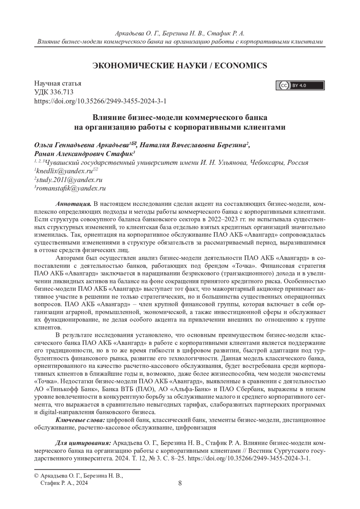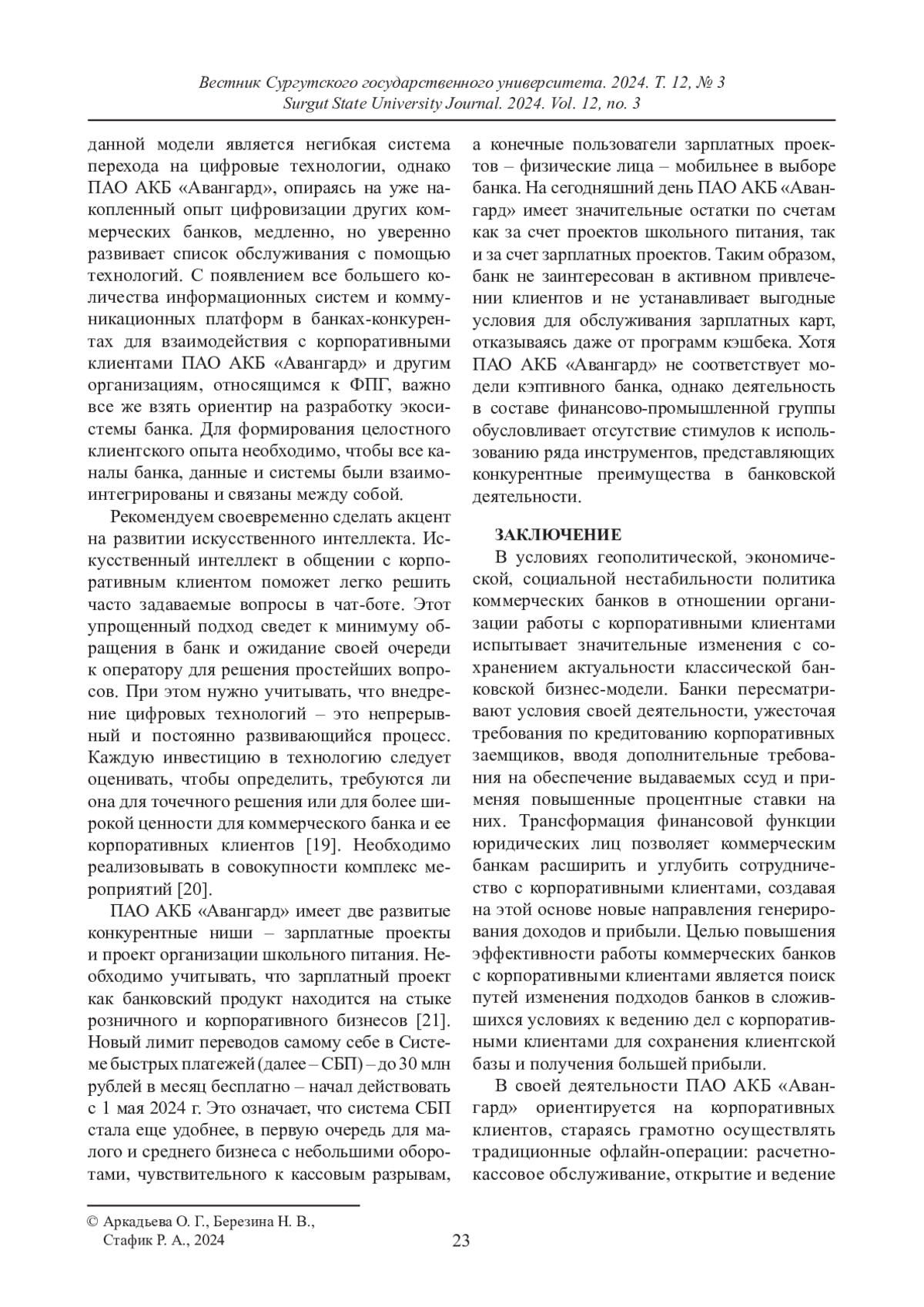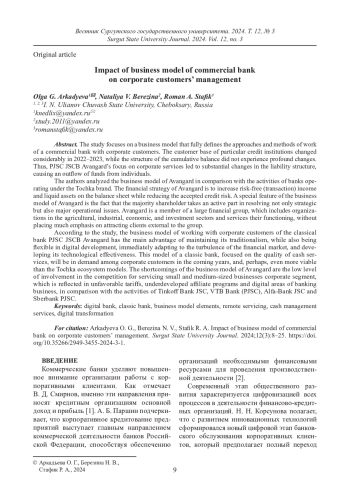 В настоящем исследовании сделан акцент на составляющих бизнес-модели, комплексно определяющих подходы и методы работы коммерческого банка с корпоративными клиентами. Если структура совокупного баланса банковского сектора в 2022–2023 гг. не испытывала существенных структурных изменений, то клиентская база отдельно взятых кредитных организаций значительно изменилась. Так, ориентация на корпоративное обслуживание ПАО АКБ «Авангард» сопровождалась существенными изменениями в структуре обязательств за рассматриваемый период, выразившимися в оттоке средств физических лиц. Авторами был осуществлен анализ бизнес-модели деятельности ПАО АКБ «Авангард» в сопоставлении с деятельностью банков, работающих под брендом «Точка». Финансовая стратегия ПАО АКБ «Авангард» заключается в наращивании безрискового (транзакционного) дохода и в увеличении ликвидных активов на балансе на фоне сокращения принятого кредитного риска. Особенностью бизнес-модели ПАО АКБ «Авангард» выступает тот факт, что мажоритарный акционер принимает активное участие в решении не только стратегических, но и большинства существенных операционных вопросов. ПАО АКБ «Авангард» – член крупной финансовой группы, которая включает в себя организации аграрной, промышленной, экономической, а также инвестиционной сферы и обслуживает их функционирование, не делая особого акцента на привлечении внешних по отношению к группе клиентов. В результате исследования установлено, что основным преимуществом бизнес-модели классического банка ПАО АКБ «Авангард» в работе с корпоративными клиентами является поддержание его традиционности, но в то же время гибкости в цифровом развитии, быстрой адаптации под турбулентность финансового рынка, развитие его технологичности. Данная модель классического банка, ориентированного на качество расчетно-кассового обслуживания, будет востребована среди корпоративных клиентов в ближайшие годы и, возможно, даже более жизнеспособна, чем модели экосистемы «Точка». Недостатки бизнес-модели ПАО АКБ «Авангард», выявленные в сравнении с деятельностью АО «Тинькофф Банк», Банка ВТБ (ПАО), АО «Альфа-Банк» и ПАО Сбербанк, выражены в низком уровне вовлеченности в конкурентную борьбу за обслуживание малого и среднего корпоративного сегмента, что выражается в сравнительно невыгодных тарифах, слаборазвитых партнерских программах и digital-направлениях банковского бизнеса.