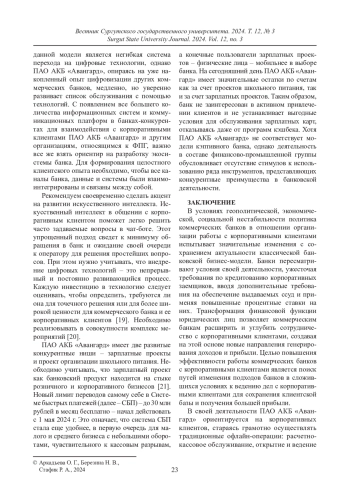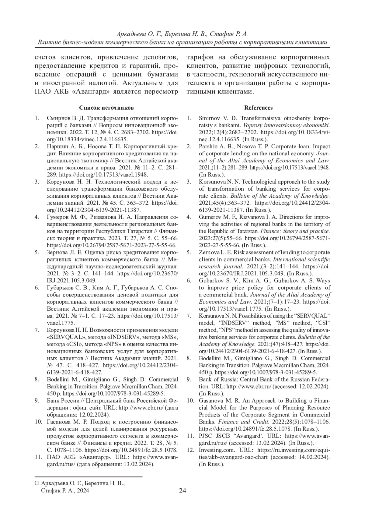 3. Корсунова Н. Н. Технологический подход к исследованию трансформации банковского обслуживания корпоративных клиентов // Вестник Академии знаний. 2021. № 45. С. 363-372. https://doi.org/10.24412/2304-6139-2021-11387.