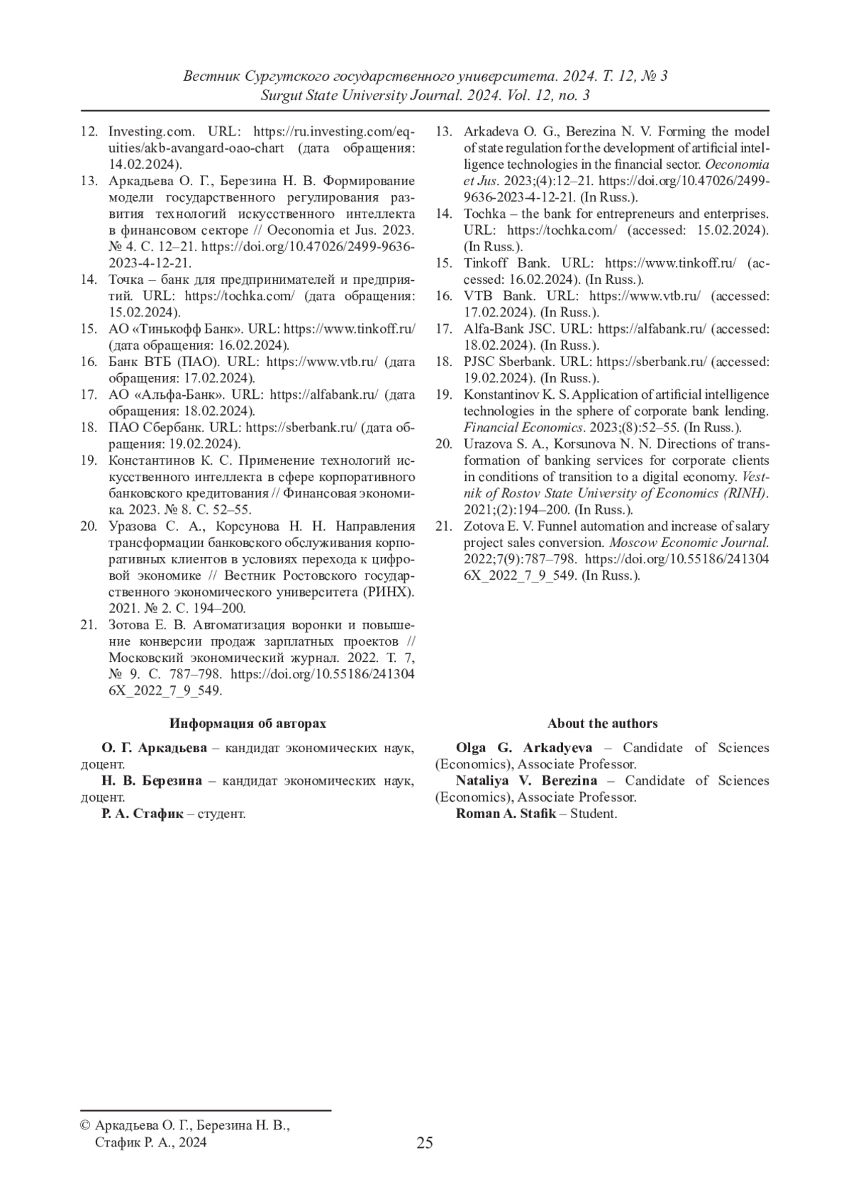 19. Константинов К. С. Применение технологий искусственного интеллекта в сфере корпоративного банковского кредитования // Финансовая экономика. 2023. № 8. С. 52-55.