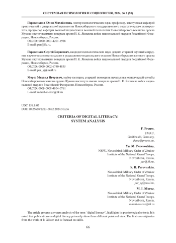 В статье представлен системный анализ термина «цифровая грамотность». Отмечается, что в публикациях по цифровой грамотности проявляются прежде всего три различные точки зрения. Первая берет свое начало с работы П. Гилстера и ориентирована на навыки. Вторая концепция основана на понимании многоаспектного характера цифровой грамотности.