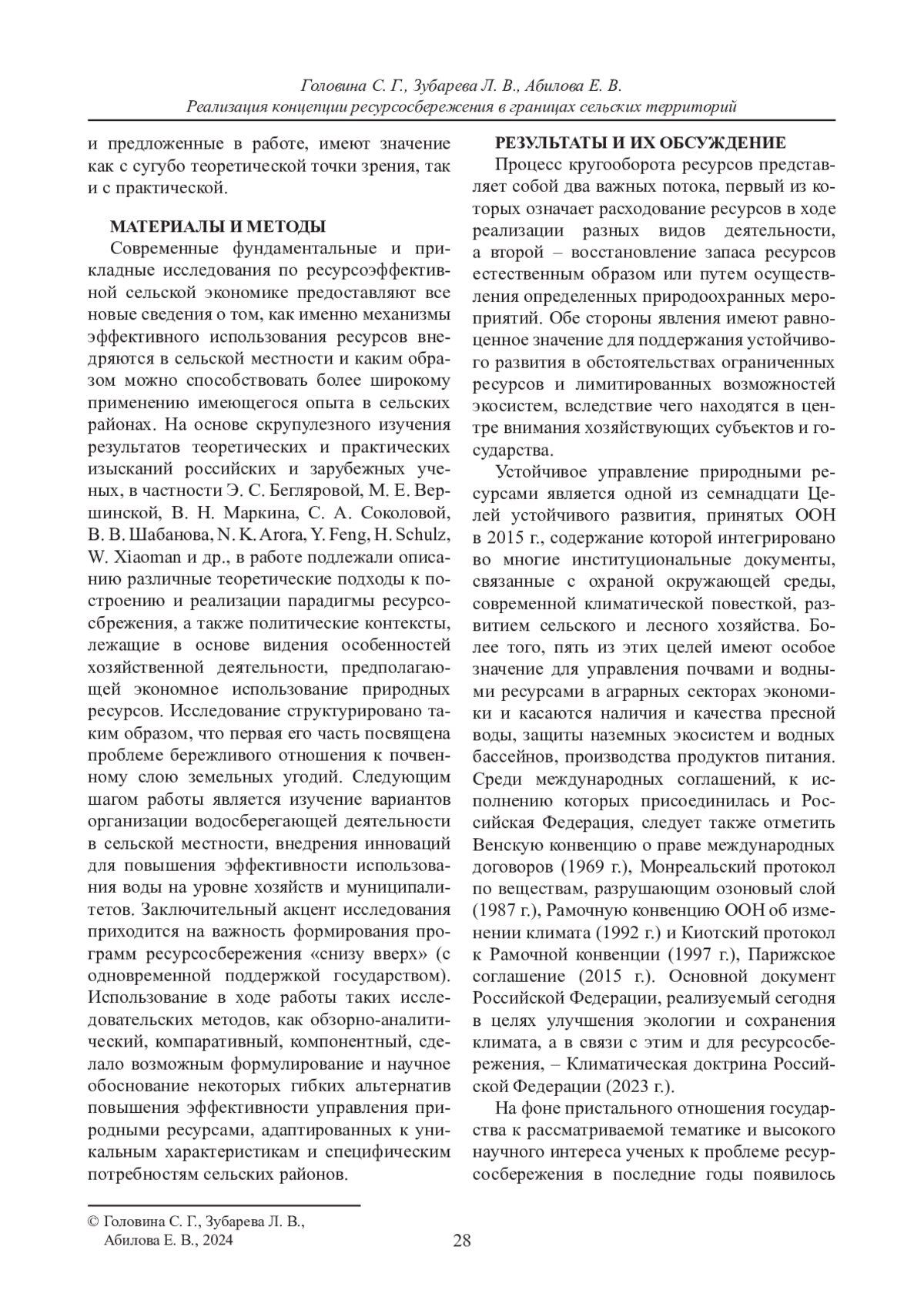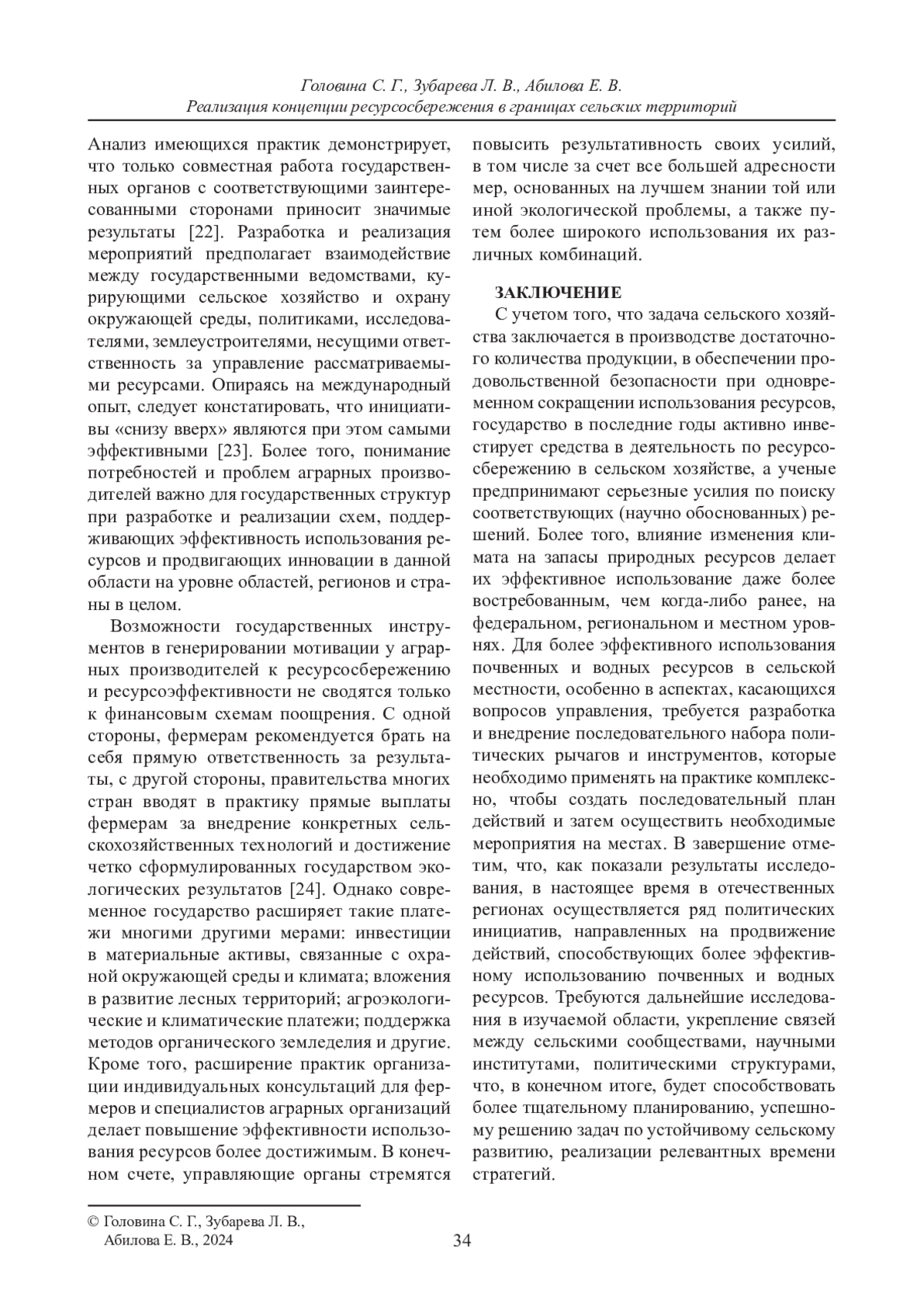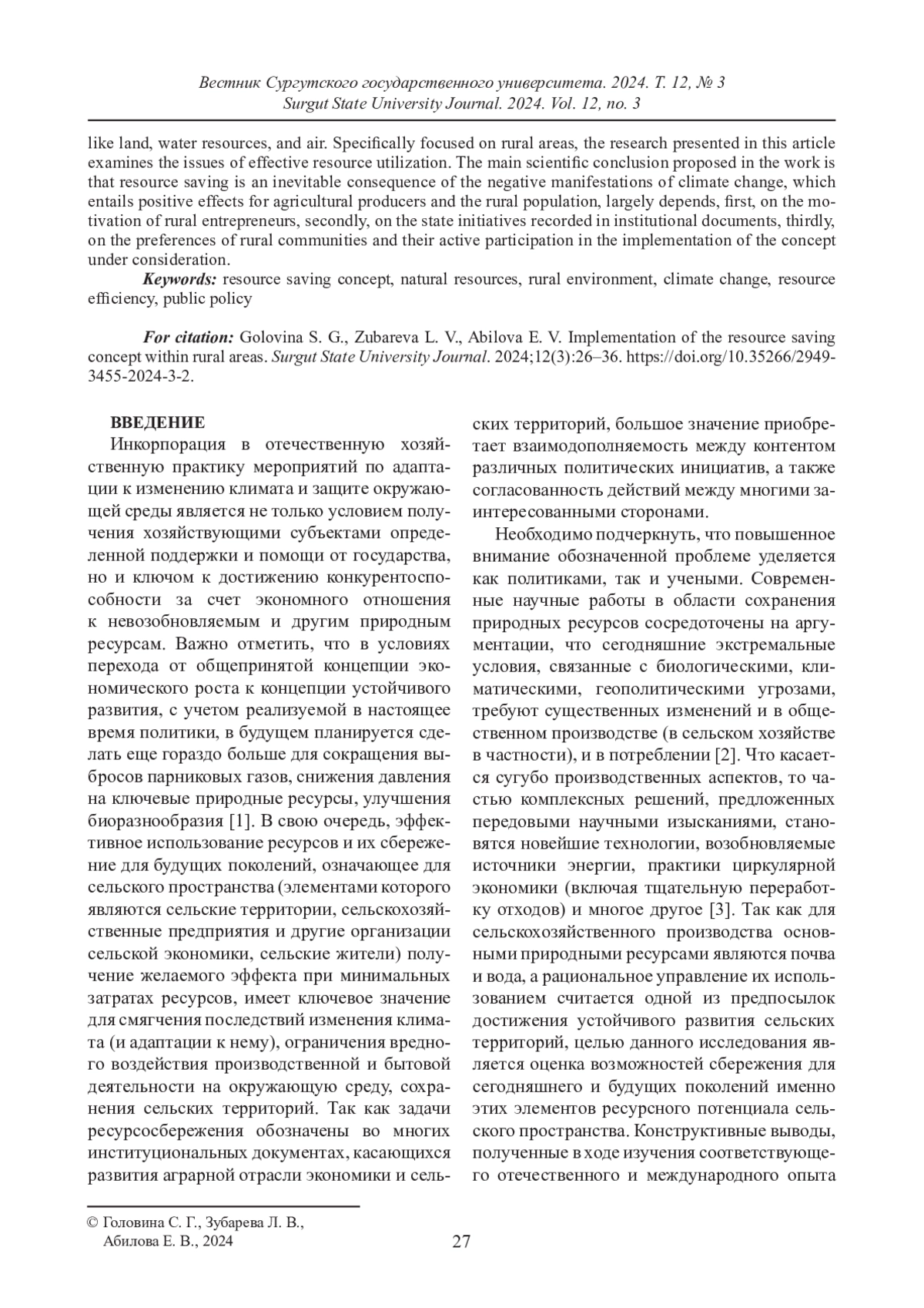 Проблема эффективного использования ресурсов становится все более актуальной в связи с популярностью концепции устойчивого развития и вызовами биологического, климатического и геополитического характера, тем или иным образом связанными с отношением общества к таким важным элементам природной среды, как земельные угодья, водные ресурсы, воздух и др. Исследование, результаты которого представлены в данной статье, связано именно с вопросами эффективного использования данных ресурсов в пределах сельских территорий. Основной научный вывод, предложенный в работе, сводится к тому, что ресурсосбережение является неизбежным следствием негативных проявлений изменения климата, влечет за собой, в свою очередь, положительные эффекты для сельхозтоваропроизводителей и сельского населения, во многом зависит, во-первых, от мотивации сельских предпринимателей, во-вторых, от инициатив государства, зафиксированных в институциональных документах, в-третьих, от предпочтений сельских сообществ и их активного участия в реализации рассматриваемой концепции.