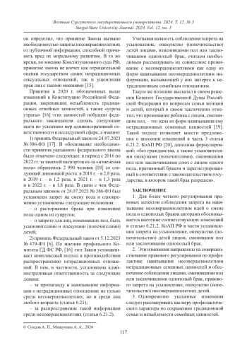 Внесение в 2020 г. изменений в Конституцию Российской Федерации [9] позволило на общегосударственном уровне установить положения о незыблемости традиционных семейных ценностей (п. «в» ч. 1 ст. 114) и защите института брака как союза мужчины и женщины (п. «ж» ч. 1 ст. 72).