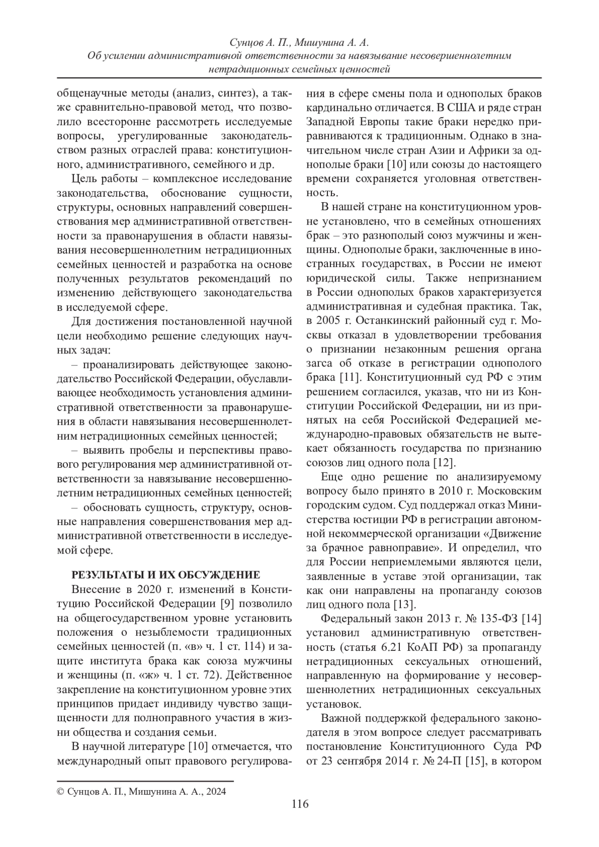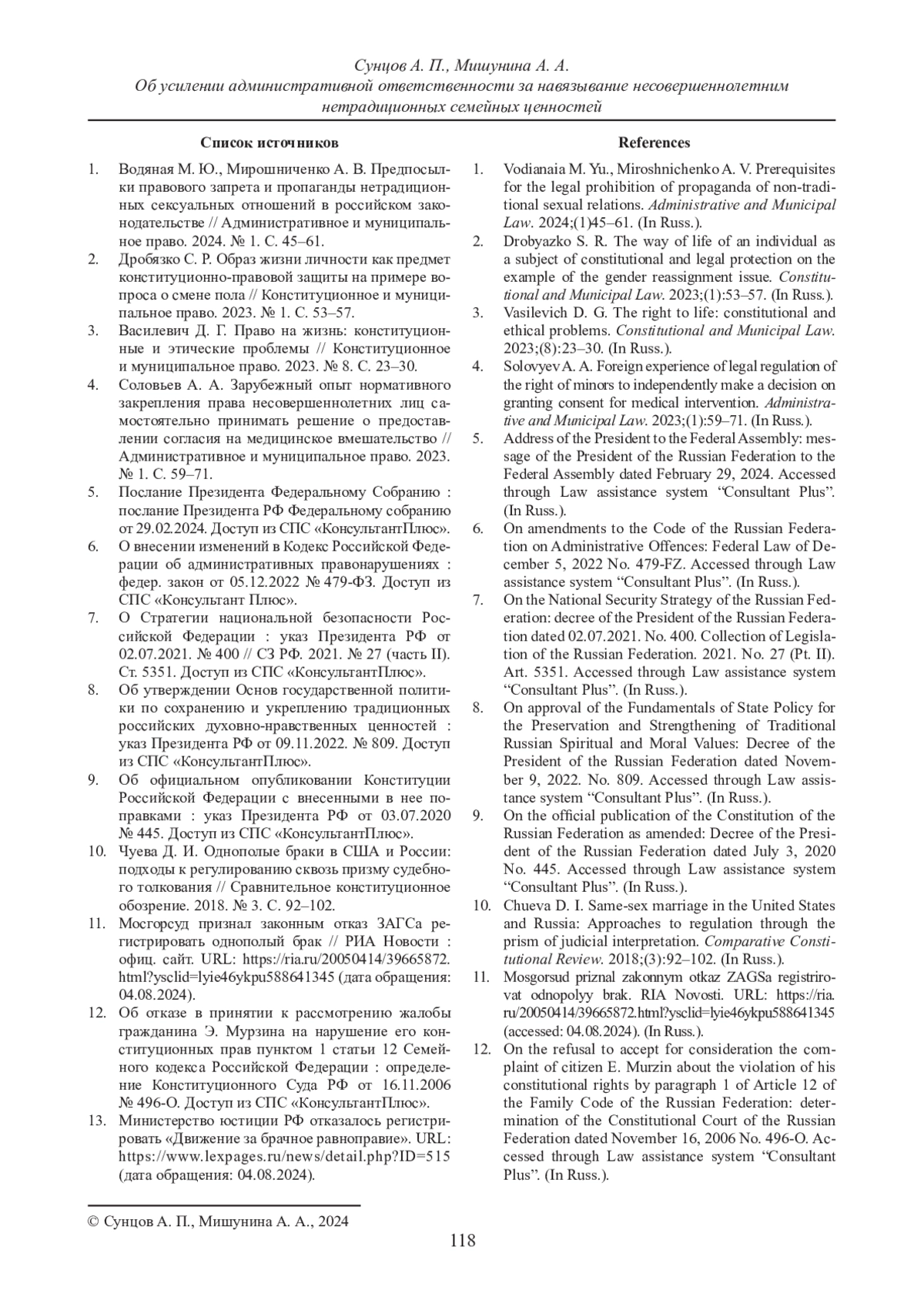 1. Водяная М. Ю., Мирошниченко А. В. Предпосылки правового запрета и пропаганды нетрадиционных сексуальных отношений в российском законодательстве // Административное и муниципальное право. 2024. № 1. С. 45-61.