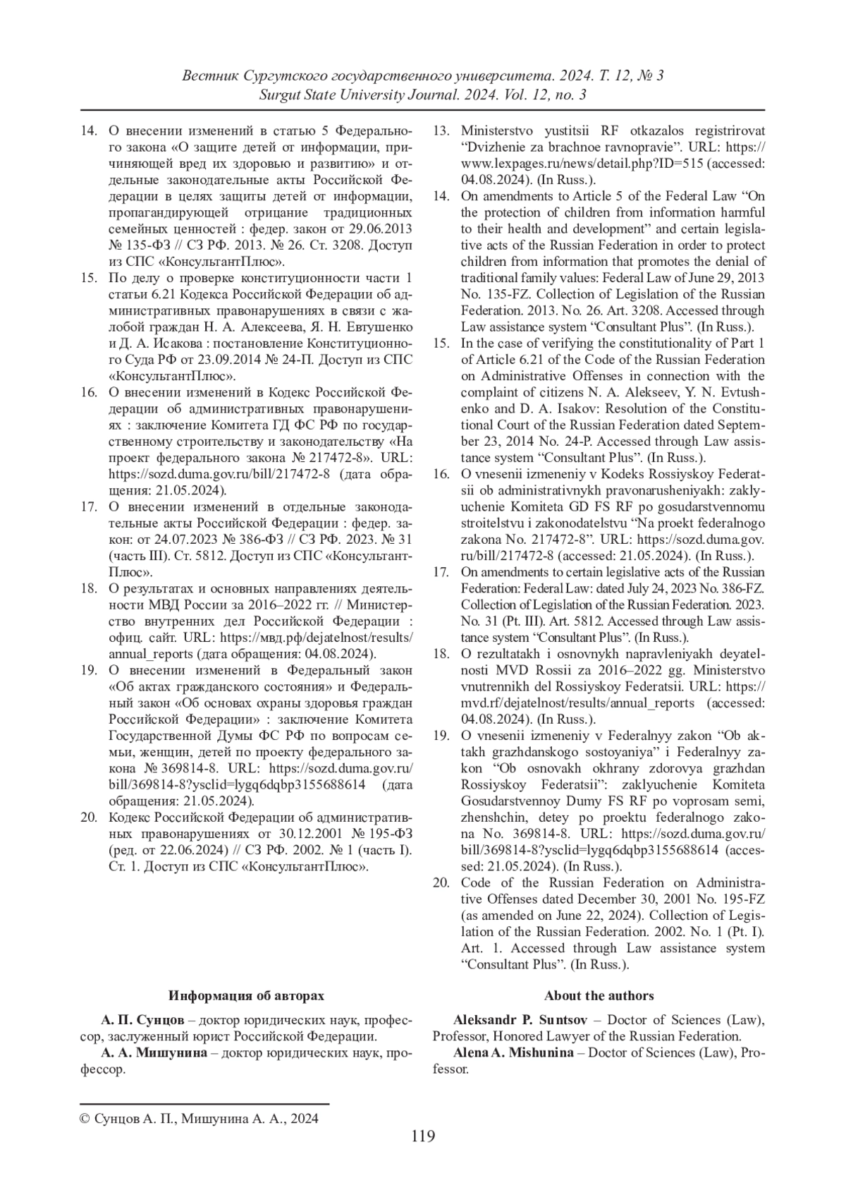 14. О внесении изменений в статью 5 Федерального закона « О защите детей от информации, причиняющей вред их здоровью и развитию» и отдельные законодательные акты Российской Федерации в целях защиты детей от информации, пропагандирующей отрицание традиционных семейных ценностей : федер. закон от 29.06.2013 № 135-ФЗ // СЗ РФ. 2013. № 26. Ст. 3208. Доступ из СПС «КонсультантПлюс».
