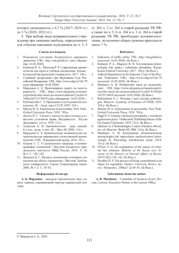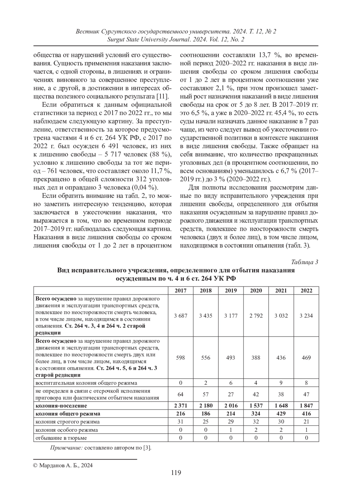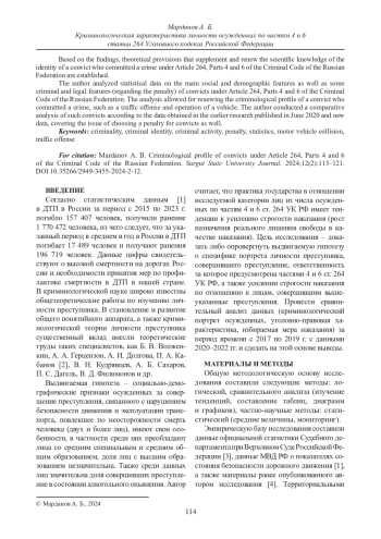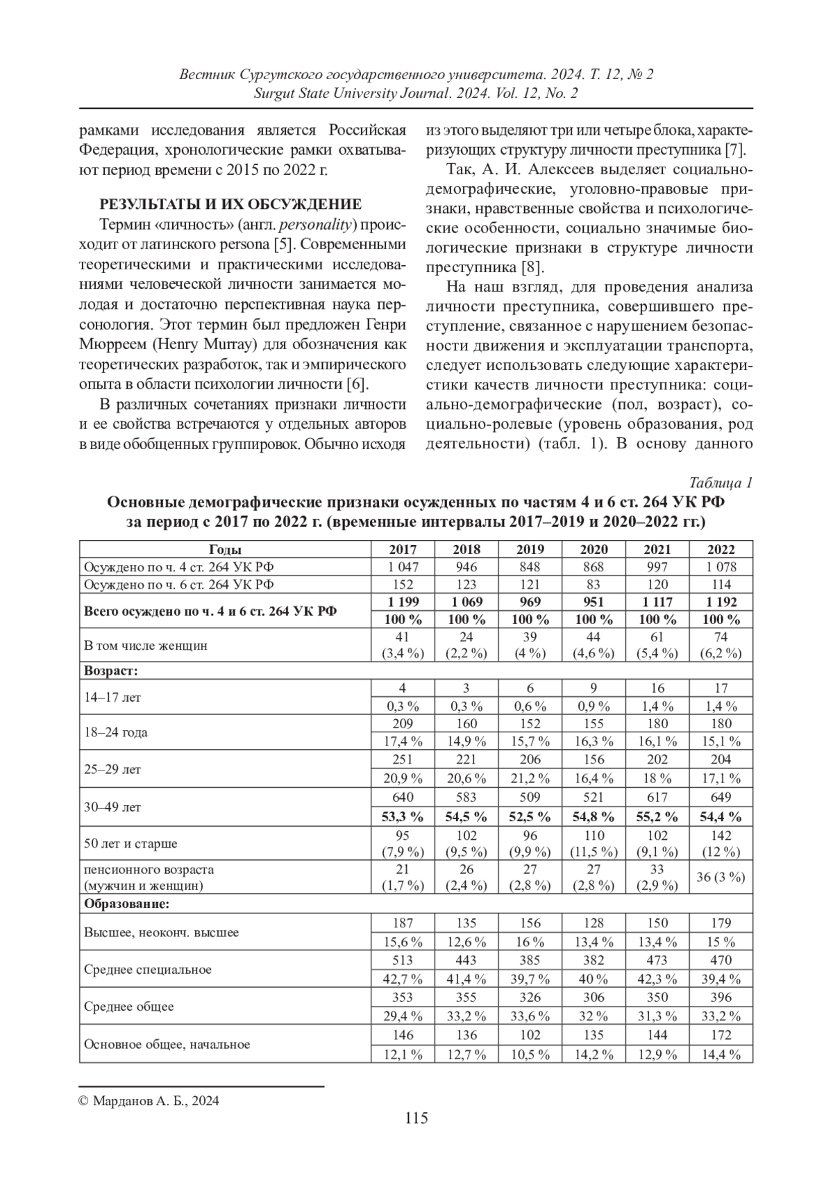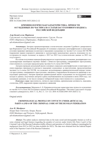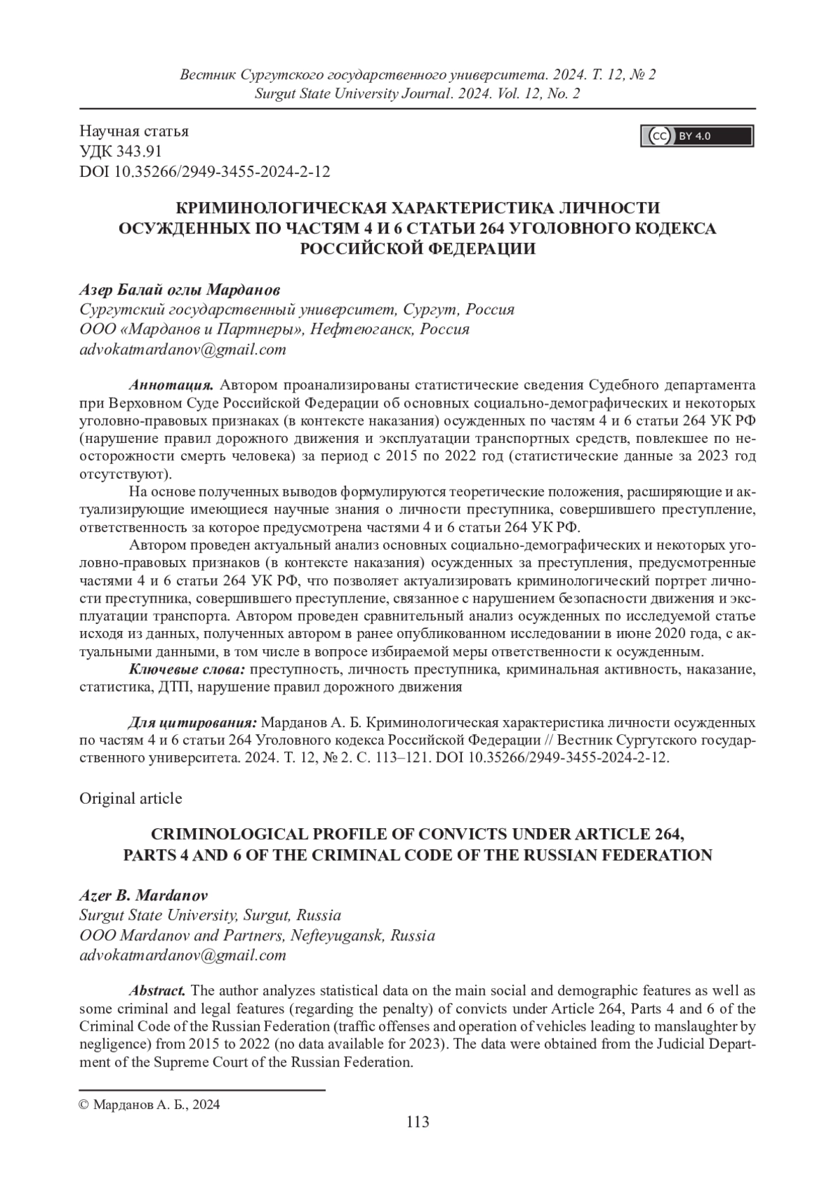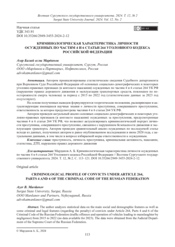 МАРДАНОВ А. Б. КРИМИНОЛОГИЧЕСКАЯ ХАРАКТЕРИСТИКА ЛИЧНОСТИ ОСУЖДЕННЫХ ПО ЧАСТЯМ 4 И 6 СТАТЬИ 264 УГОЛОВНОГО КОДЕКСА РОССИЙСКОЙ ФЕДЕРАЦИИ // ВЕСТНИК СУРГУТСКОГО ГОСУДАРСТВЕННОГО УНИВЕРСИТЕТА. 2024. ТОМ 12, № 2