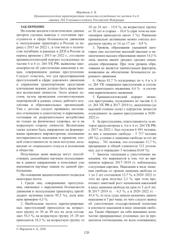 Статья: КРИМИНОЛОГИЧЕСКАЯ ХАРАКТЕРИСТИКА ЛИЧНОСТИ ОСУЖДЕННЫХ ПО ЧАСТЯМ 4 И 6 СТАТЬИ 264 УГОЛОВНОГО КОДЕКСА РОССИЙСКОЙ ФЕДЕРАЦИИ (2024)