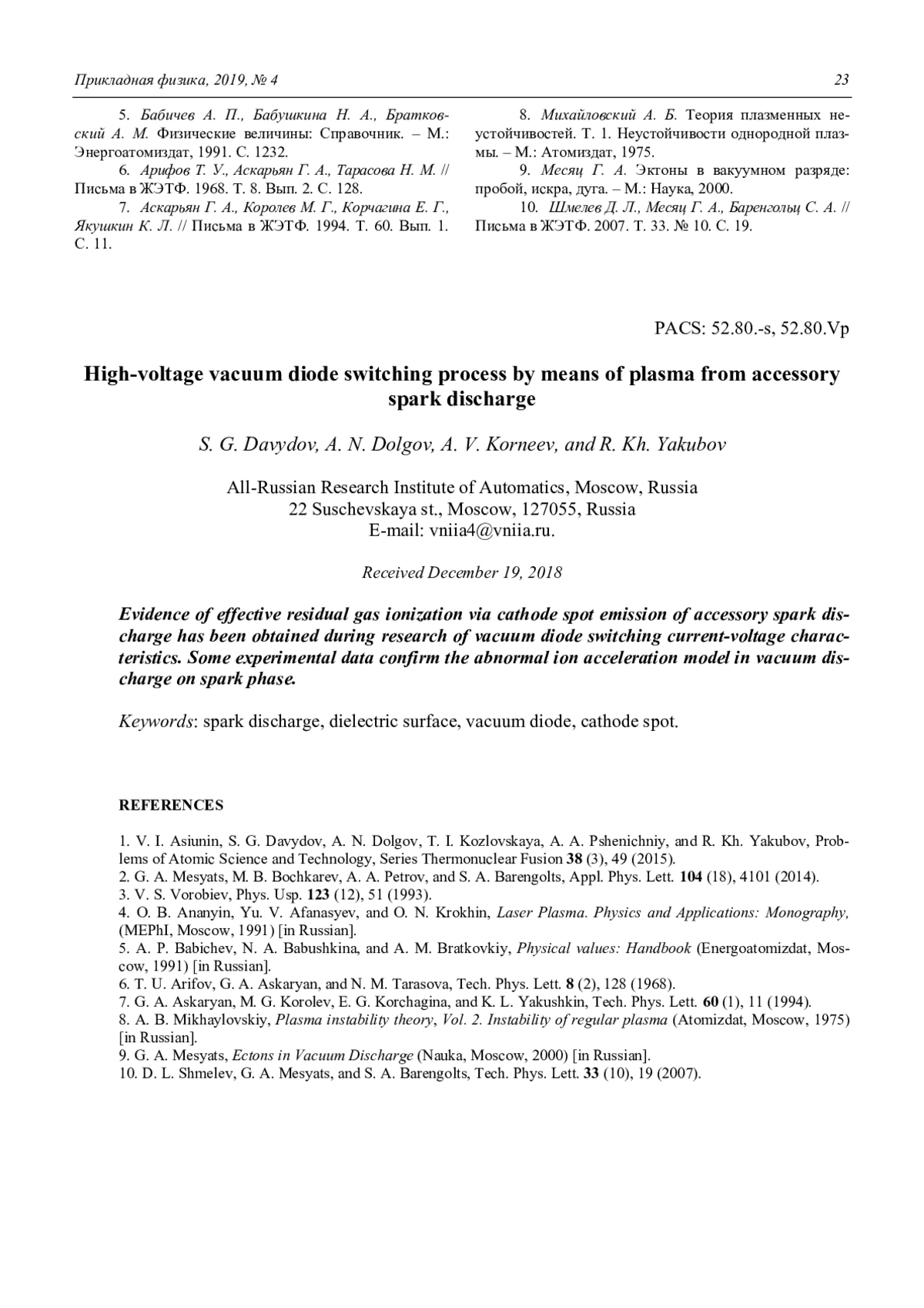 S. G. Davydov, A. N. Dolgov, A. V. Korneev, and R. Kh. Yakubov High-voltage vacuum diode switching process by means of plasma from accessory spark discharge 19