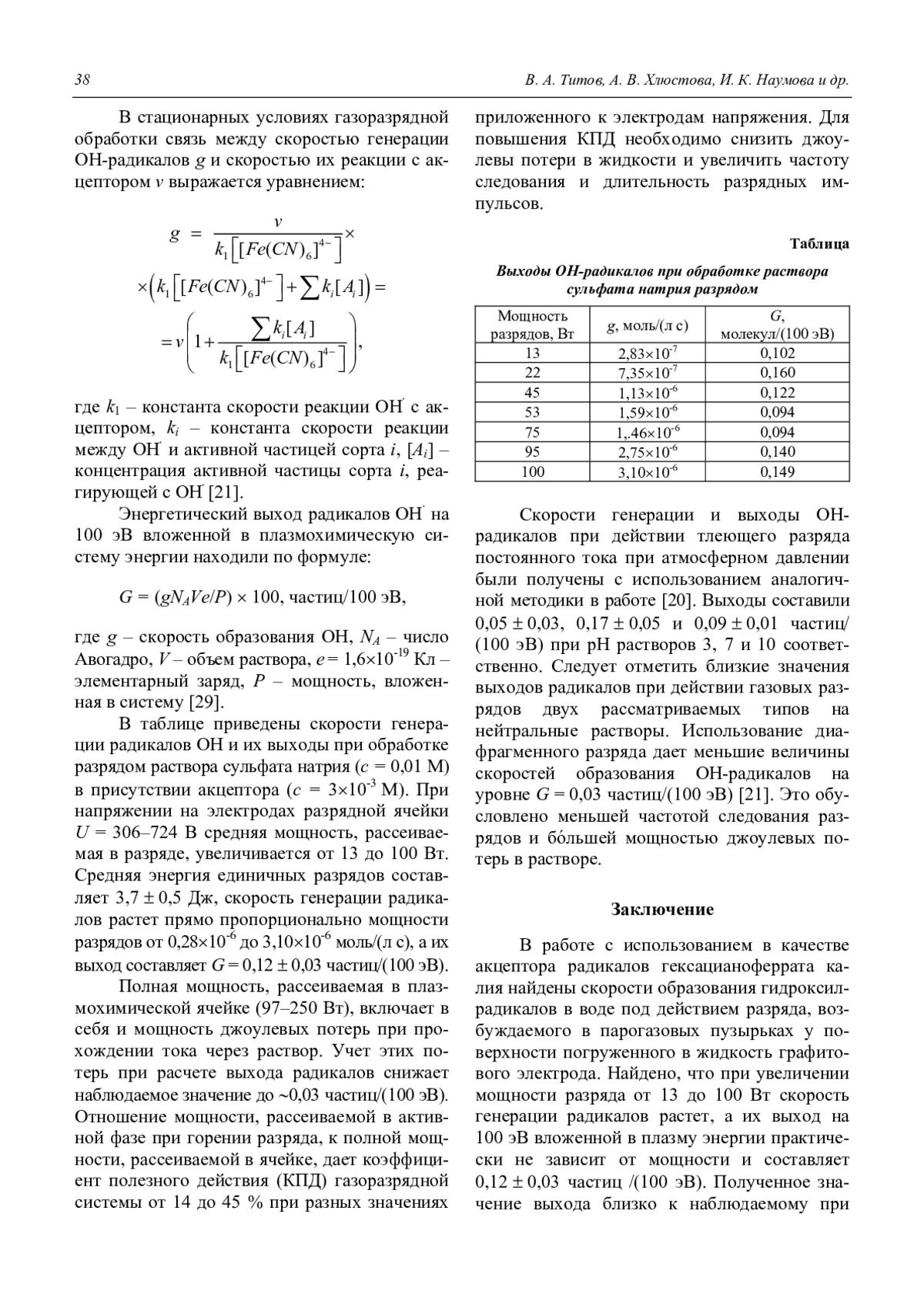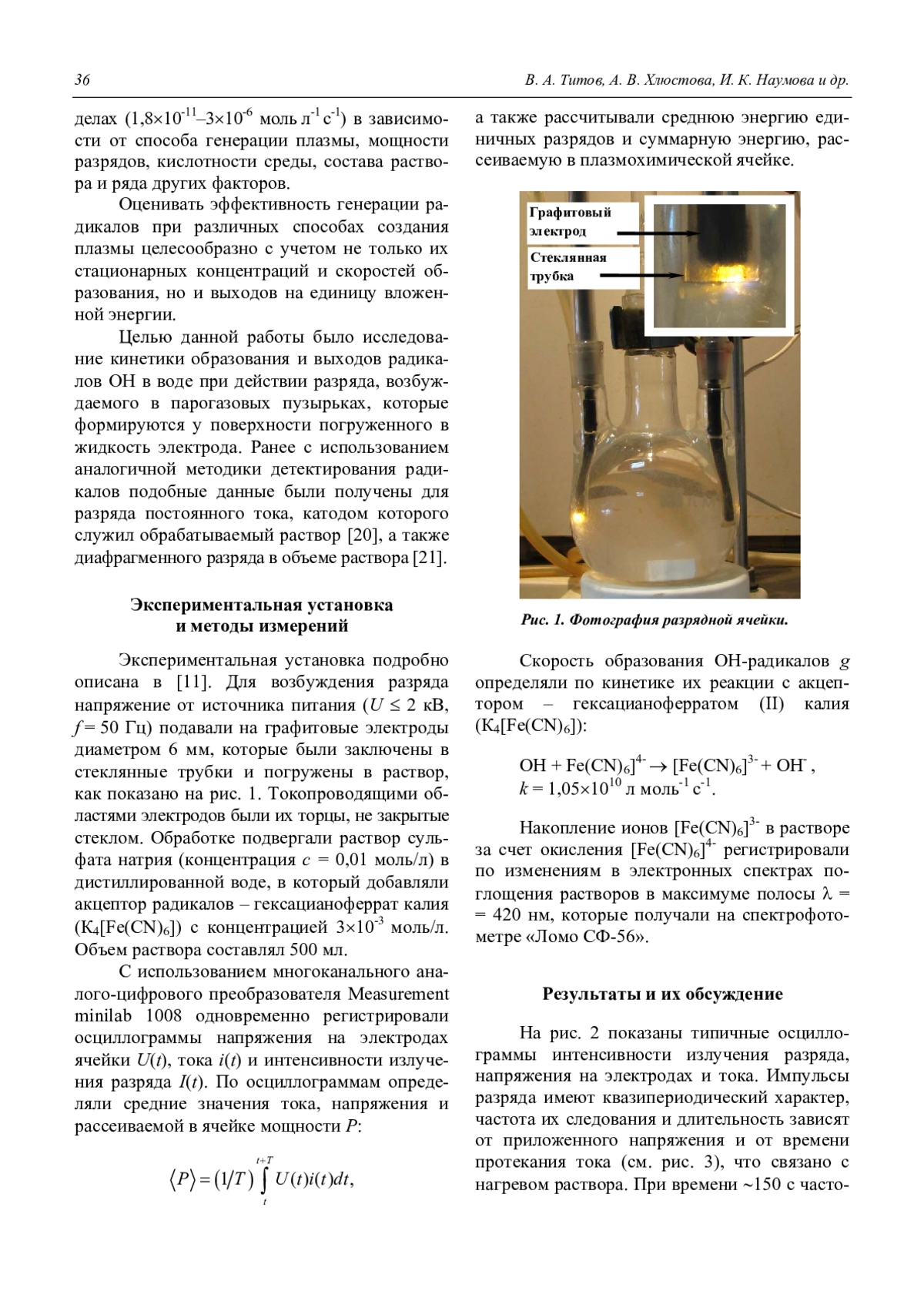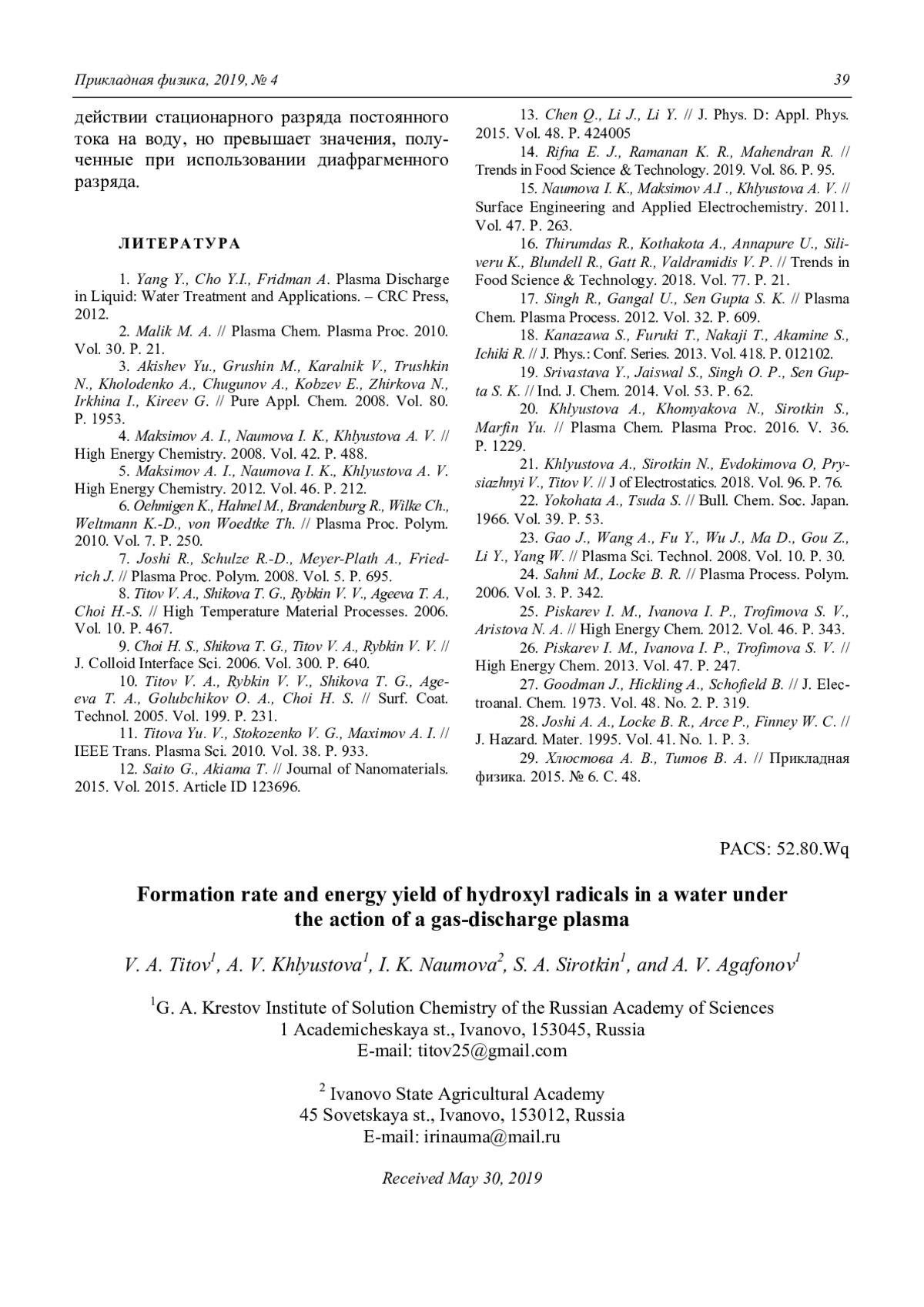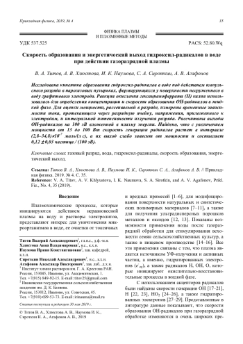 Титов В. А., Хлюстова А. В., Наумова И. К., Сироткин С. А., Агафонов А. В. Скорость образования и энергетический выход гидроксил-радикалов в воде при дей-ствии газоразрядной плазмы 35