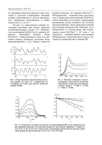 Исследована кинетика образования гидроксил-радикалов в воде под действием импульсного разряда в парогазовых пузырьках, формирующихся у поверхности погруженного в воду графитового электрода. Реакция окисления гексацианоферрата (II) калия использовалась для определения концентрации и скорости образования ОН-радикалов в жидкой фазе. Для оценки мощности, рассеиваемой в разряде, измерены временные зависимости тока, протекающего через разрядную ячейку, напряжения, приложенного к электродам, и интегральной интенсивности излучения разряда. Рассчитаны выходы ОН-радикалов на 100 эВ вложенной в плазму энергии. Найдено, что с увеличением мощности от 13 до 100 Вт скорость генерации радикалов растет в интервале (2,8–34,8)10-7 моль/(л с), а их выход слабо зависит от мощности и составляет 0,12 0,03 частица / (100 эВ).