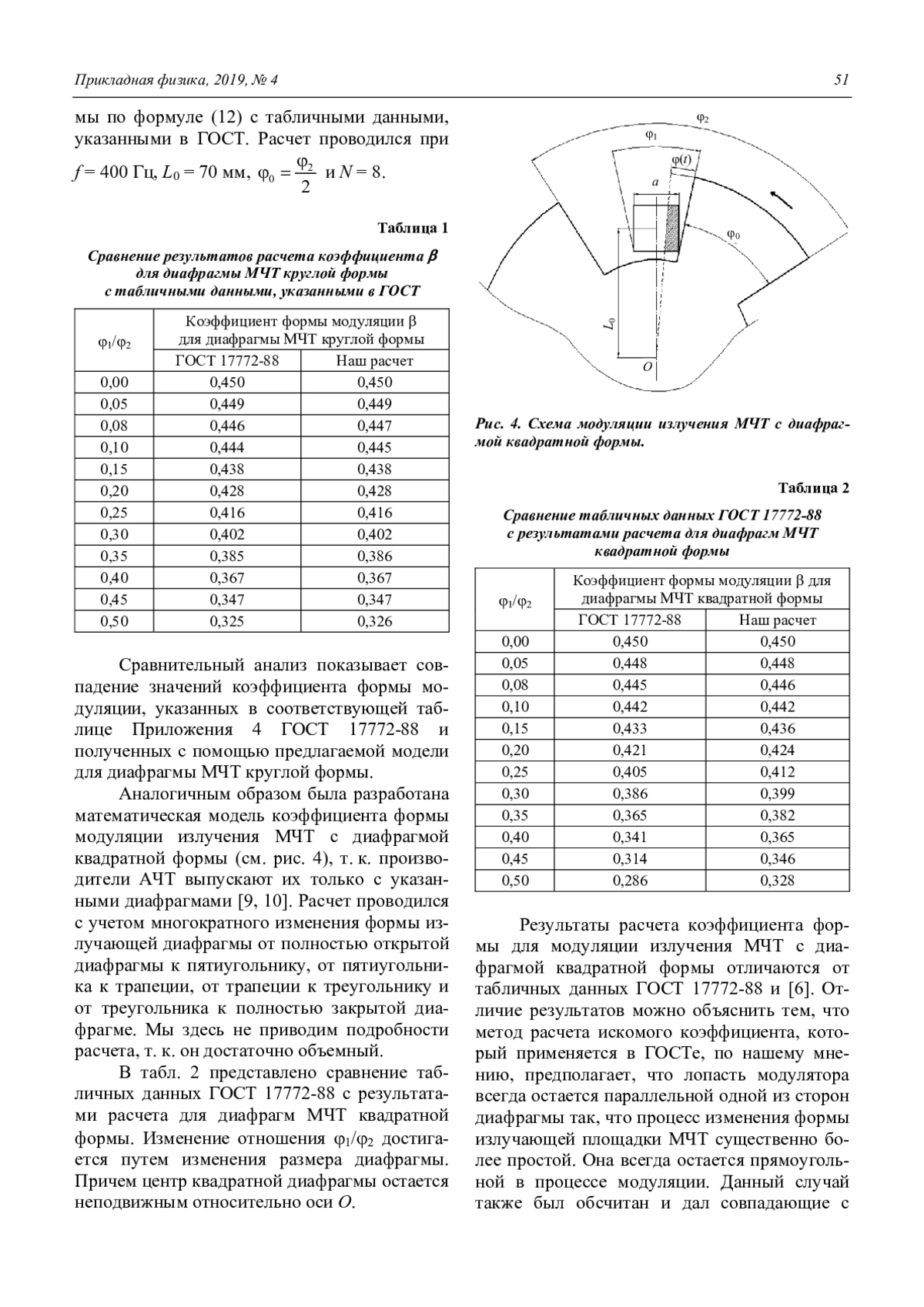 Рассмотрено подробное описание процесса модуляции излучения МЧТ. Разработана корректная математическая модель для метода расчета коэффициента формы модуляции излучения МЧТ с диафрагмой круглой и квадратной форм. Проведен сравнительный анализ значений коэффициентов формы модуляции излучения МЧТ с данными указанными в ГОСТ 17772-88 и [6]. Для круглых диафрагм получено полное соответствие с литературными источниками. Для квадратных диафрагм выявлено их несоответствие с табличными данными ГОСТ 17772-88 и [6]. Установлена причина несоответствия коэффициентов, обусловленная упрощенным предположением авторов [5] и [6] о взаимном расположении квадратной диафрагмы и лопастей модулятора в модели расчета. Выявлена необходимость корректировки таблицы 2 Приложения 4 ГОСТ 17772-88.