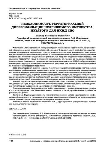 Статья затрагивает тему разнообразия использования недвижимости, конфискованной в рамках проведения специальной военной операции. Она делает акцент на эффективном распределении недвижимости среди военных структур, гражданского сектора и экономических нужд, учитывая уникальные особенности каждого региона. В контексте повышения эффективности использования городских зон, множество федеральных и региональных программ предлагают новые подходы. Эти изменения предъявляют новые требования к организациям, отвечающим за управление городскими пространствами. Комплексное управление имуществом муниципалитетов (КУИМ) требует мультидисциплинарного подхода и взаимодействие множества участников для успешной реализации проектов по преобразованию городских территорий.