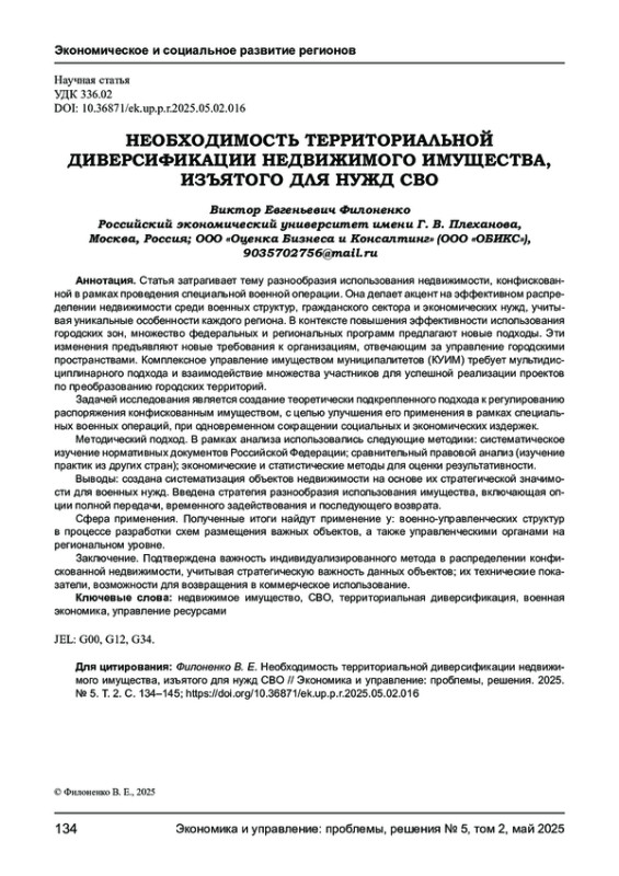 16. Филоненко В. Е. Оценка полезности имущества для нужд СВО: методика, практика и критерии полезности имущества в условиях военного времени. Теоретический анализ // Экономика и управление: проблемы, решения. 2025. № 4. Т. 7. EDN: BWJWSG
