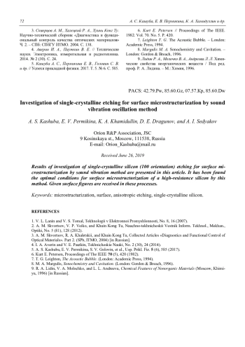 A. S. Kashuba, E. V. Permikina, K. A. Khamidullin, D. E. Dragunov, and A. I. Sedyakov Investigation of single-crystalline etching for surface microstructurization by sound vibration oscillation method 66