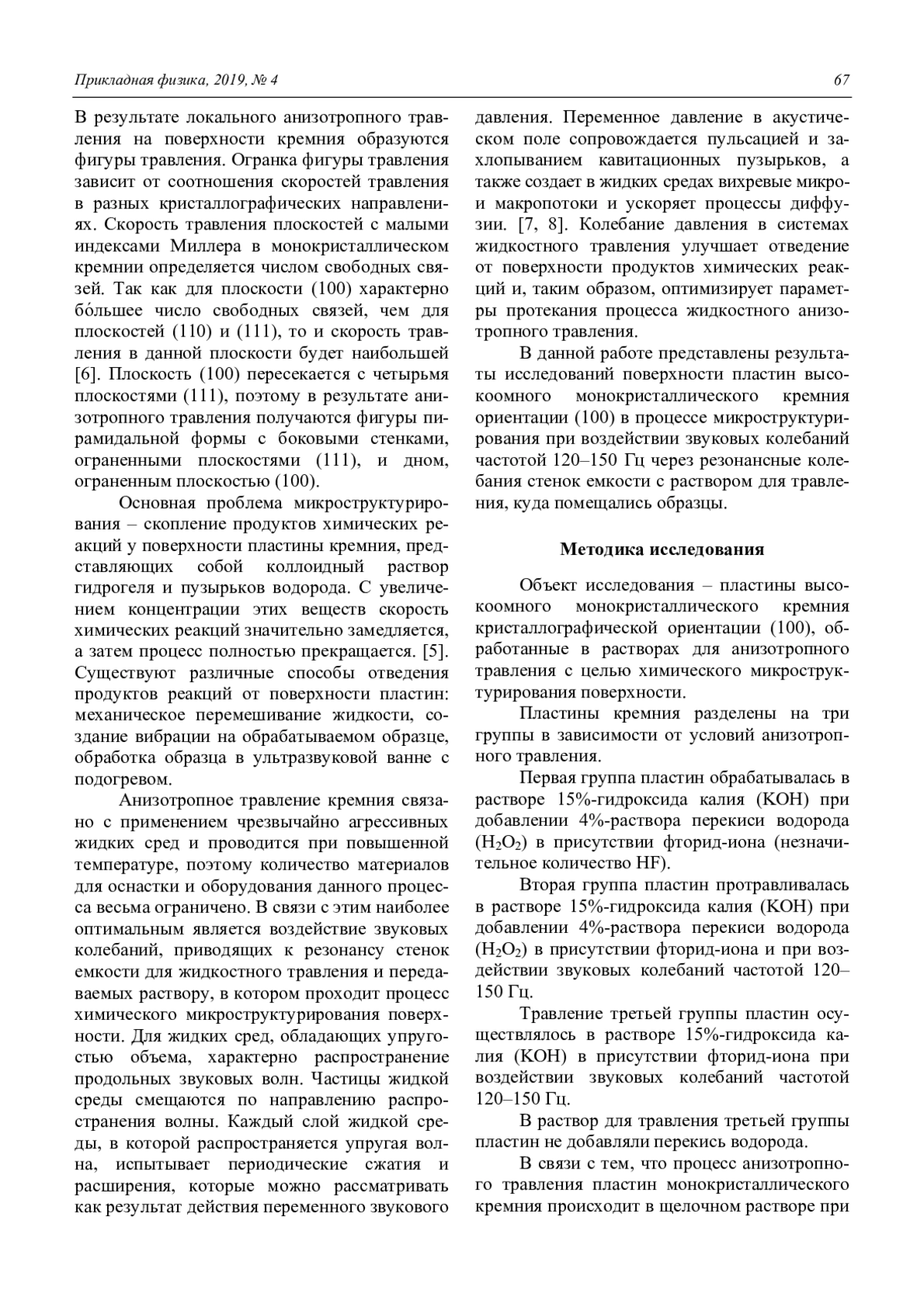В работе приведены результаты исследований воздействия звуковых колебаний в процессе химического микроструктурирования поверхности монокристаллического кремния ориентации (100). Установлено, что акустические эффекты при частоте звуковых колебаний 120–150 Гц позволяют получать фигуры травления заданной конфигурации по всей площади поверхности образцов. Показано, что для улучшения конфигурации ямок травления, в раствор, где происходит процесс травления кремния, целесообразно добавлять перекись водорода.