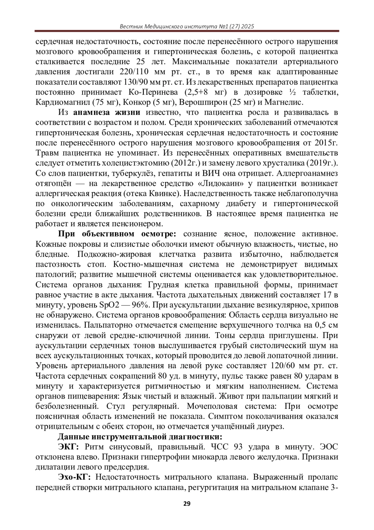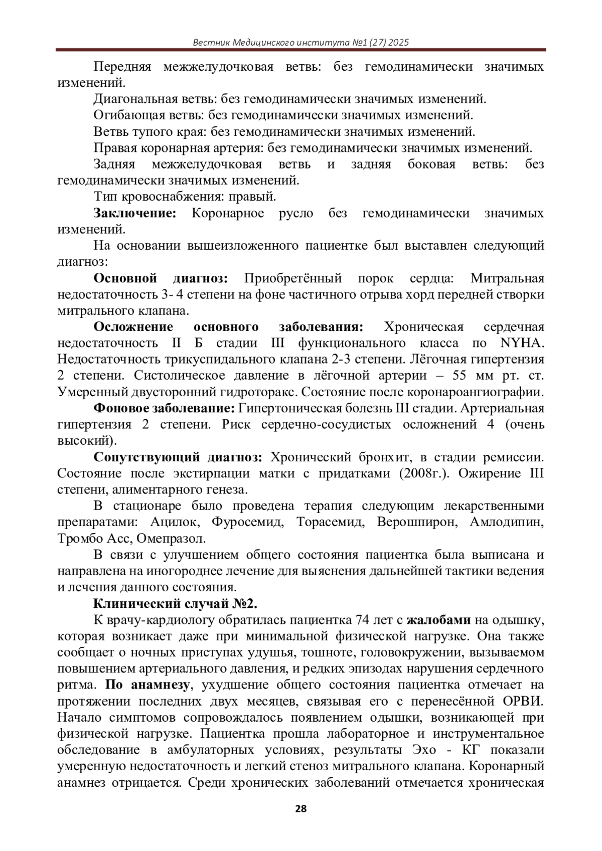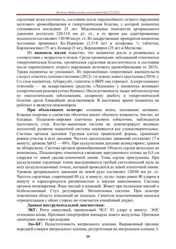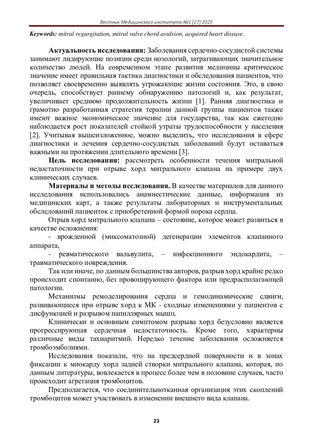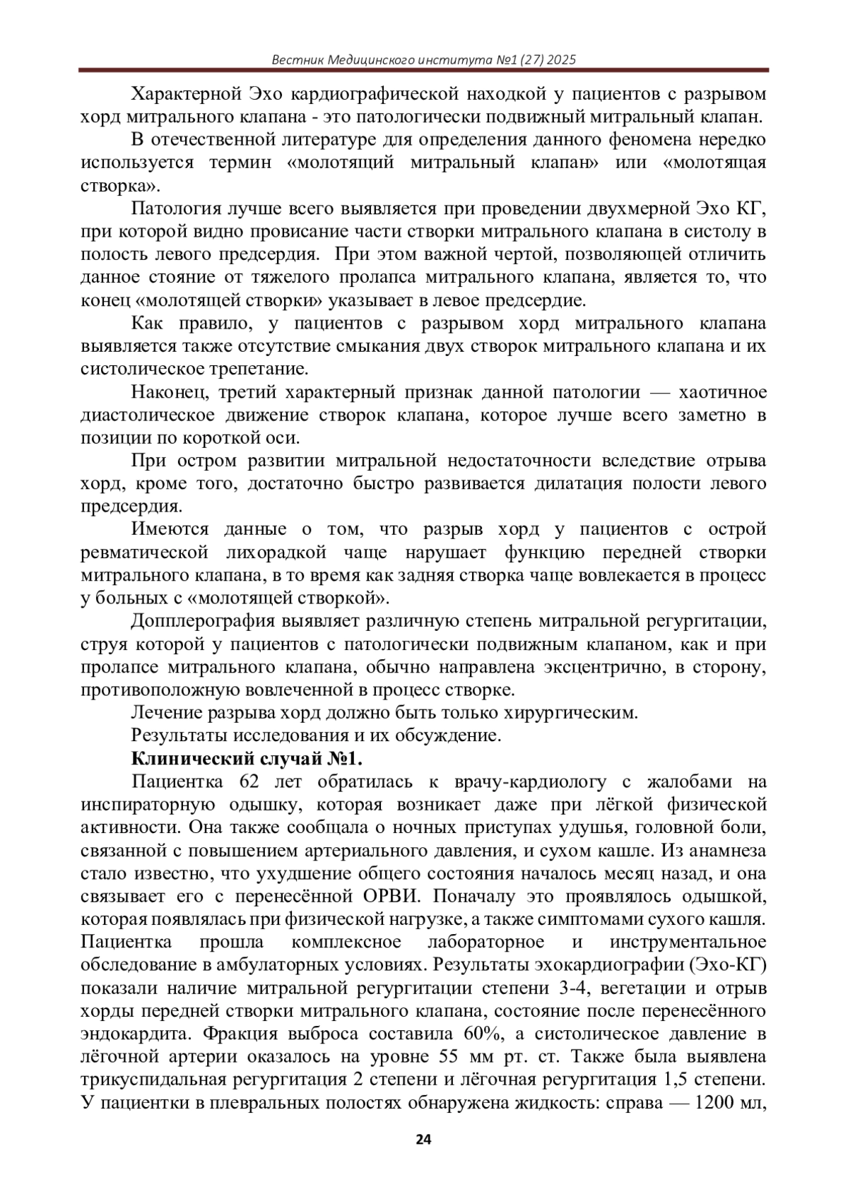 Статья: ОСОБЕННОСТИ РАЗВИТИЯ КЛИНИЧЕСКОЙ КАРТИНЫ МИТРАЛЬНОЙ НЕДОСТАТОЧНОСТИ НА ФОНЕ ОТРЫВА ХОРД ПЕРЕДНЕЙ СТВОРКИ МИТРАЛЬНОГО КЛАПАНА (2025)