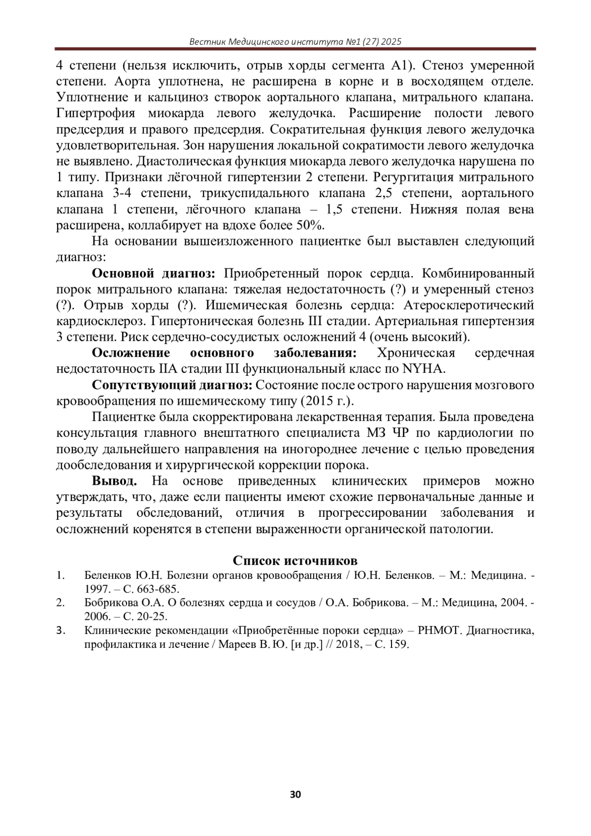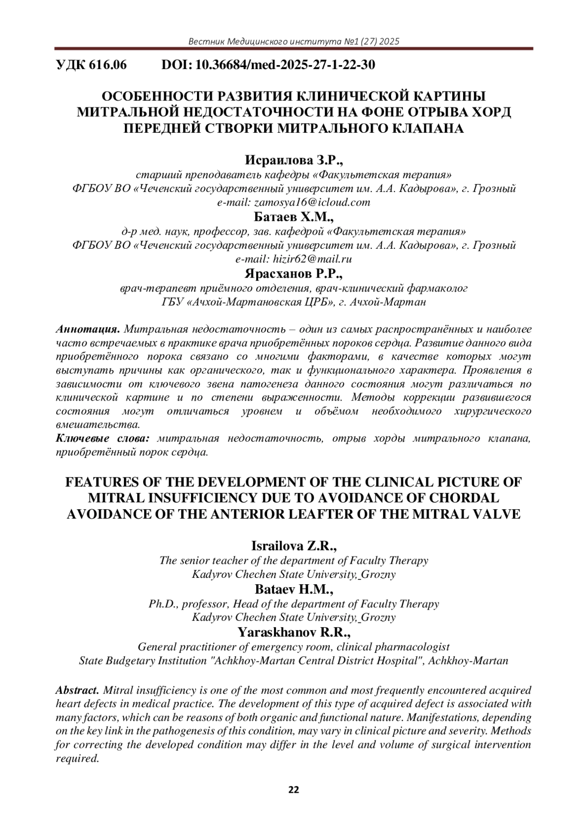 ЯРАСХАНОВ Р.Р., БАТАЕВ Х.М., ИСРАИЛОВА З.Р. ОСОБЕННОСТИ РАЗВИТИЯ КЛИНИЧЕСКОЙ КАРТИНЫ МИТРАЛЬНОЙ НЕДОСТАТОЧНОСТИ НА ФОНЕ ОТРЫВА ХОРД ПЕРЕДНЕЙ СТВОРКИ МИТРАЛЬНОГО КЛАПАНА // ВЕСТНИК МЕДИЦИНСКОГО ИНСТИТУТА. 2025. № 1 (27)