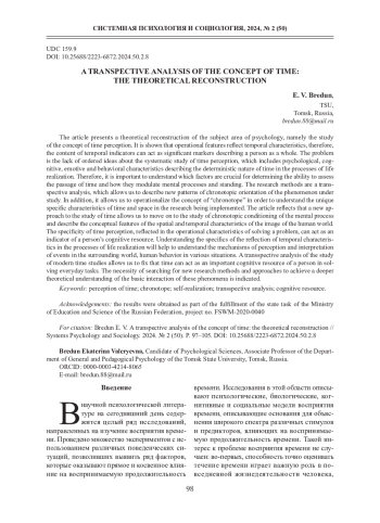 БРЕДУН Е. В. ТРАНССПЕКТИВНЫЙ АНАЛИЗ КОНЦЕПТА ВРЕМЕНИ: ТЕОРЕТИЧЕСКАЯ РЕКОНСТРУКЦИЯ // СИСТЕМНАЯ ПСИХОЛОГИЯ И СОЦИОЛОГИЯ. 2024. № 2 (50)