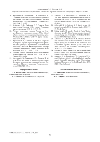 19. Землянский Д. Ю., Махрова А. Г., Медведникова Д. М. Методические подходы к составлению комплексных индексов социально-экономического развития городов // Вестник Московского университета. Серия 5. География. 2020. № 4. С. 21-31.