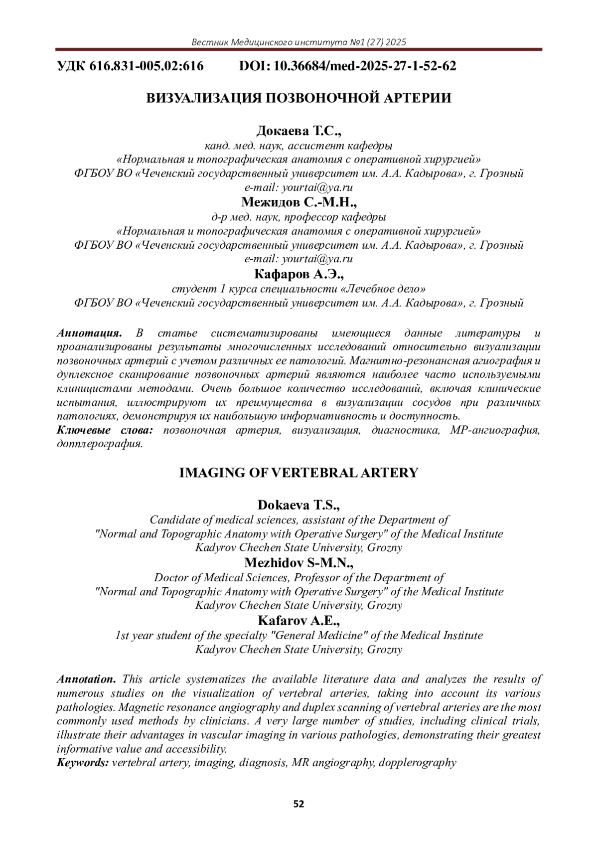 Позвоночные артерии (ПА) обеспечивают основное артериальное снабжение структур задней черепной ямки. Они также вносят важный вклад в кровообращение передних отделов головного мозга при определенных обстоятельствах. Аномалии, затрагивающие ПА, могут иметь разрушительные последствия, которые не менее инвалидизируют, чем те, которые затрагивают сонные артерии. ПА можно визуализировать с помощью различных методов. Монишу [15] приписывают первую церебральную ангиограмму. С тех пор были разработаны различные методы визуализации анатомии ПА; они включают в себя ультразвук, цифровую субтракционную ангиографию, спиральную компьютерную томографическую ангиографию (КТА), магнитно-резонансную томографию (МРТ) и магнитно-резонансную ангиографию (МРА). Кроме того, разрабатываются экспериментальные методы, включая позитронно-эмиссионную томографию (ПЭТ) с использованием 18Fфтордезоксиглюкозы (ФДГ) и контрастно-усиленную МРТ для визуализации функциональной активности в патологических поражениях ПА.