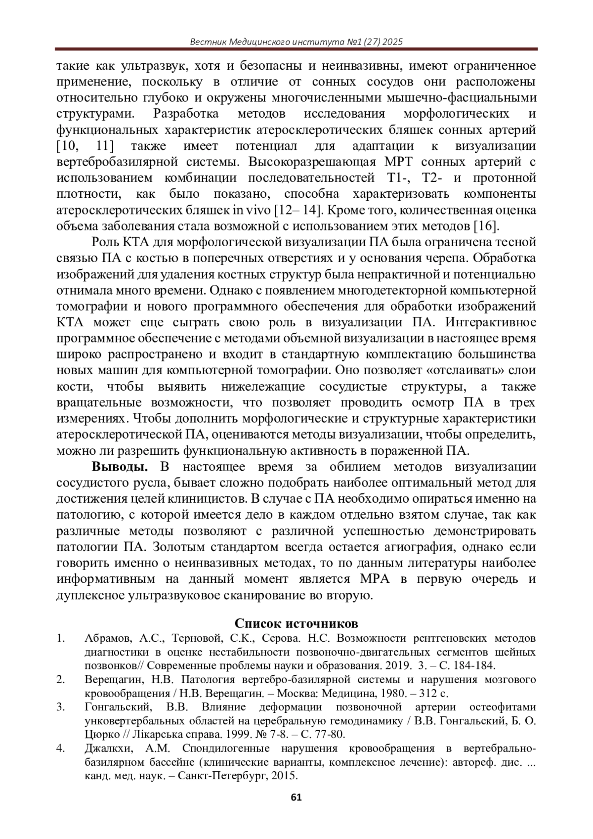 3. Гонгальский, В.В. Влияние деформации позвоночной артерии остеофитами унковертербальных областей на церебральную гемодинамику / В.В. Гонгальский, Б. О. Цюрко // Лiкарська справа. 1999. № 7-8. - С. 77-80.