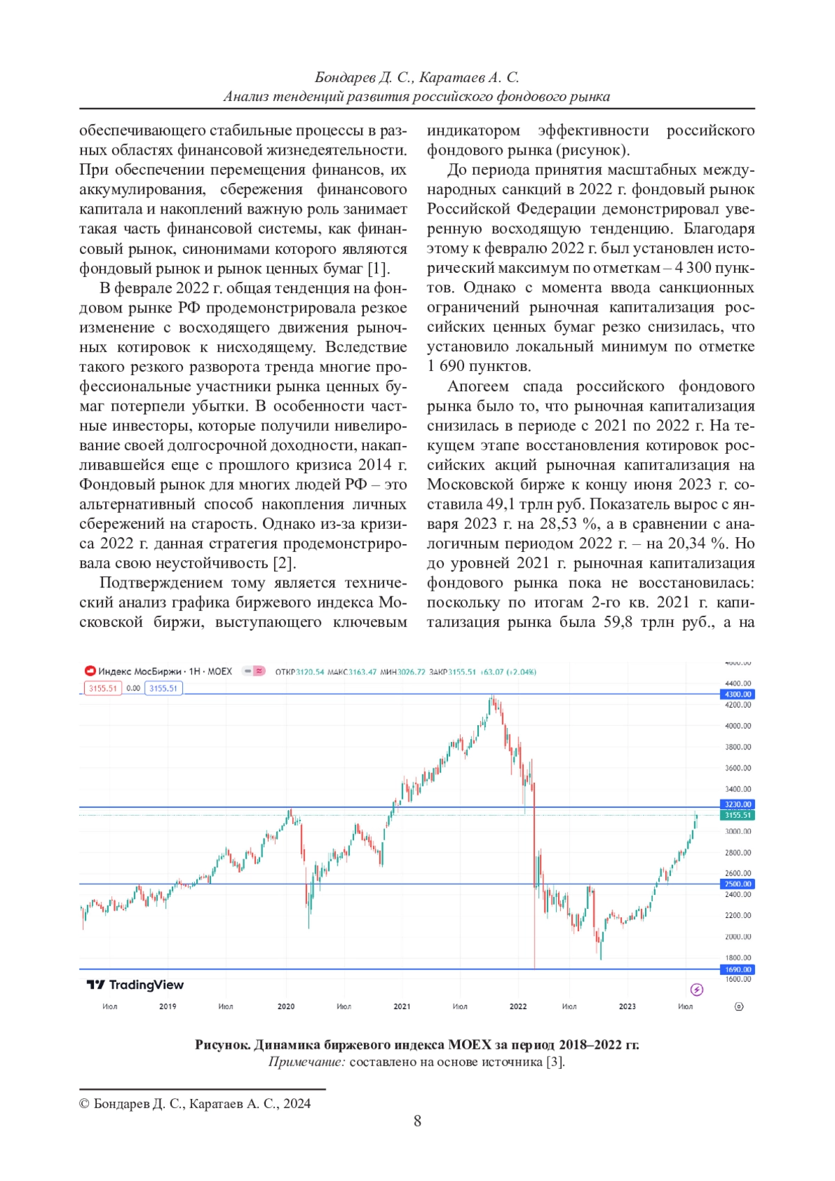 Первый период восстановления, который происходил в 2022 г., характеризуется тем, что рыночные котировки биржевого индекса Московской биржи не превышали горизонтальную линию сопротивления по отметке 2 500 пунктов.