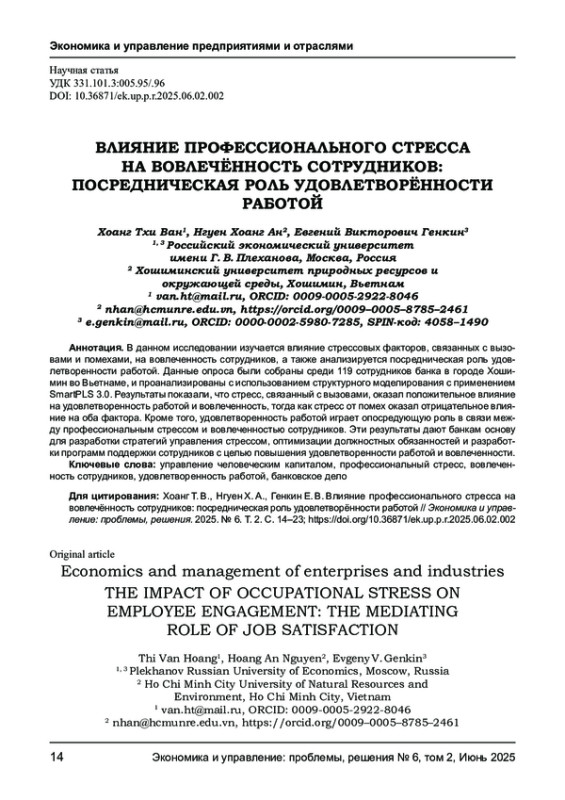 В данном исследовании изучается влияние стрессовых факторов, связанных с вызовами и помехами, на вовлеченность сотрудников, а также анализируется посредническая роль удовлетворенности работой. Данные опроса были собраны среди 119 сотрудников банка в городе Хошимин во Вьетнаме, и проанализированы с использованием структурного моделирования с применением SmartPLS 3.0. Результаты показали, что стресс, связанный с вызовами, оказал положительное влияние на удовлетворенность работой и вовлеченность, тогда как стресс от помех оказал отрицательное влияние на оба фактора. Кроме того, удовлетворенность работой играет опосредующую роль в связи между профессиональным стрессом и вовлеченностью сотрудников. Эти результаты дают банкам основу для разработки стратегий управления стрессом, оптимизации должностных обязанностей и разработки программ поддержки сотрудников с целью повышения удовлетворенности работой и вовлеченности.