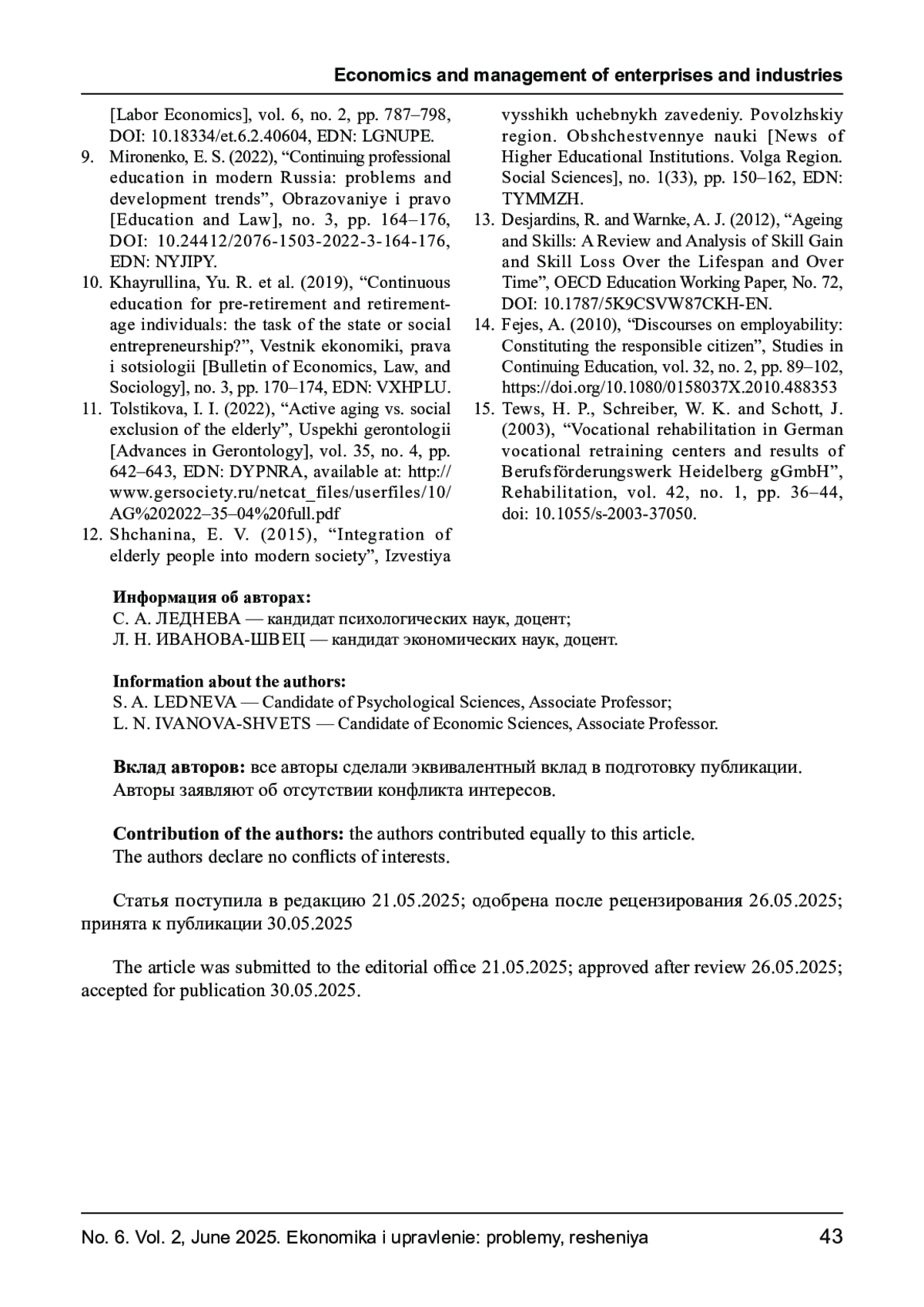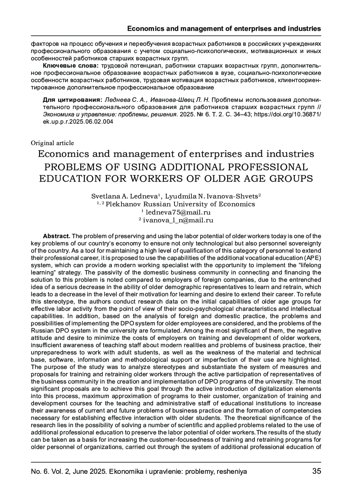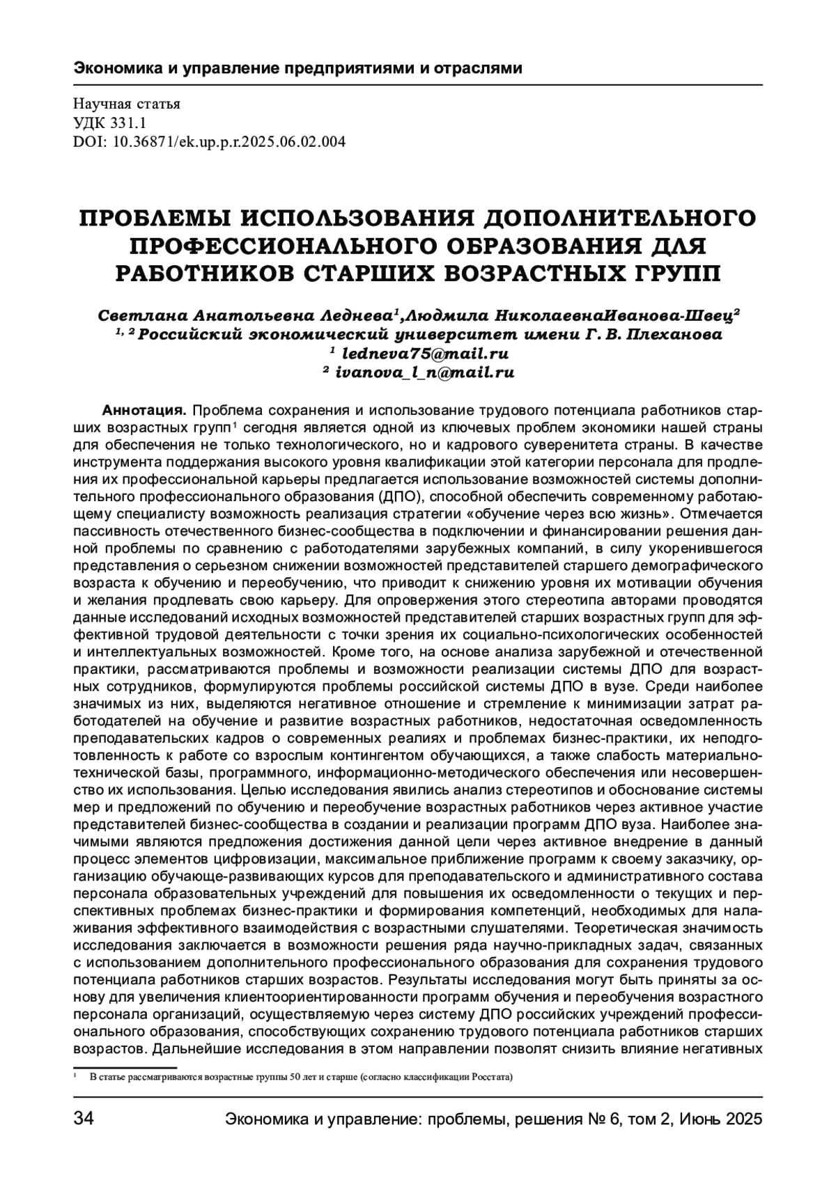 ЛЕДНЕВА С. А., ИВАНОВА-ШВЕЦ Л. Н. ПРОБЛЕМЫ ИСПОЛЬЗОВАНИЯ ДОПОЛНИТЕЛЬНОГО ПРОФЕССИОНАЛЬНОГО ОБРАЗОВАНИЯ ДЛЯ РАБОТНИКОВ СТАРШИХ ВОЗРАСТНЫХ ГРУПП // ЭКОНОМИКА И УПРАВЛЕНИЕ: ПРОБЛЕМЫ, РЕШЕНИЯ. 2025. ТОМ 2 № 6