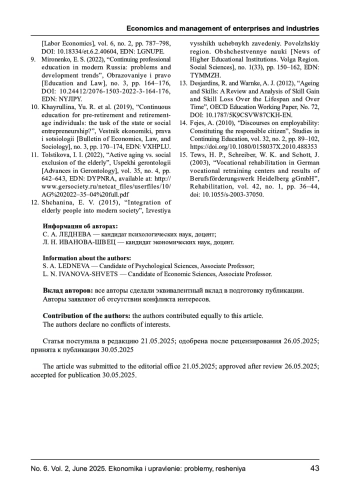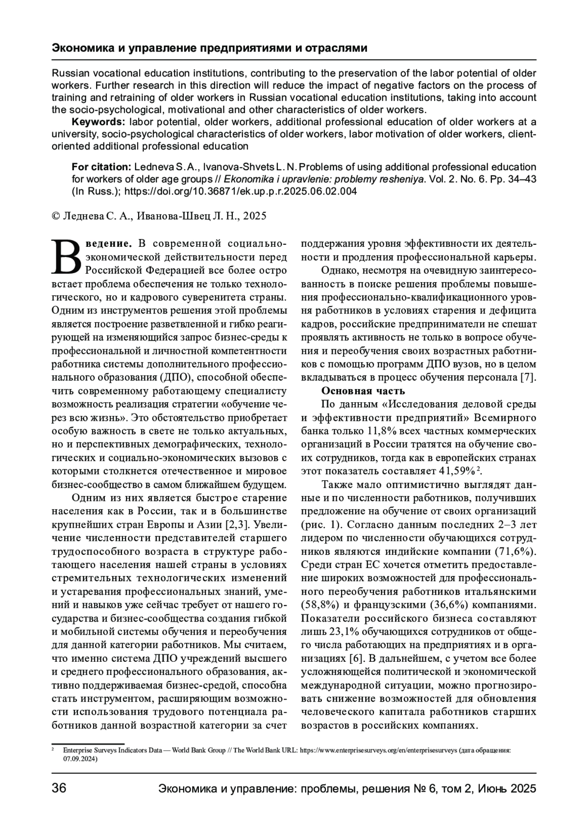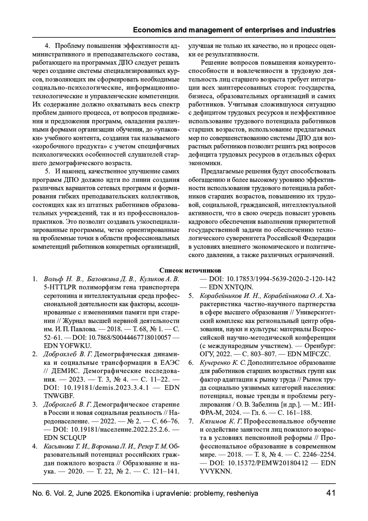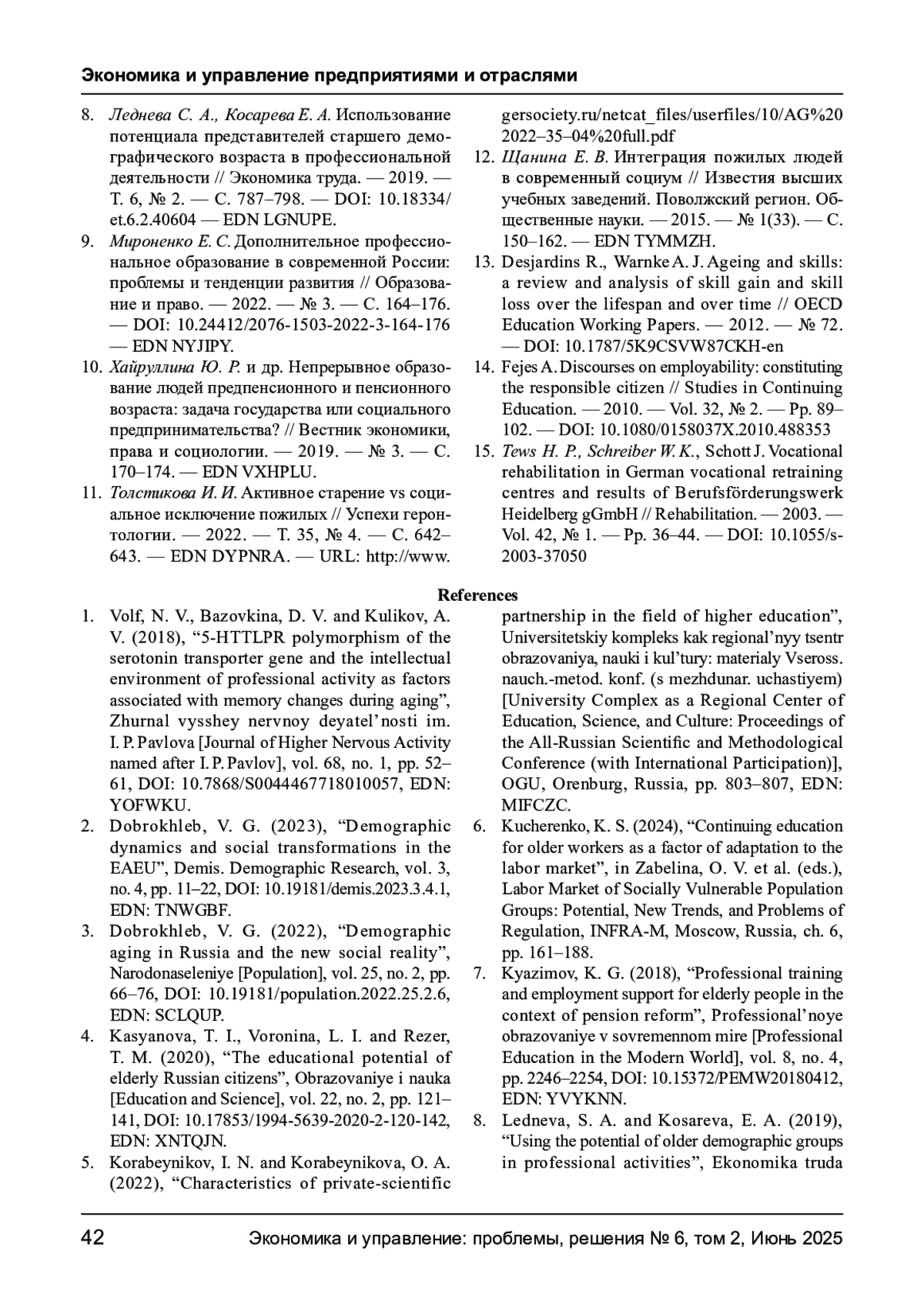 ЛЕДНЕВА С. А., ИВАНОВА-ШВЕЦ Л. Н. ПРОБЛЕМЫ ИСПОЛЬЗОВАНИЯ ДОПОЛНИТЕЛЬНОГО ПРОФЕССИОНАЛЬНОГО ОБРАЗОВАНИЯ ДЛЯ РАБОТНИКОВ СТАРШИХ ВОЗРАСТНЫХ ГРУПП // ЭКОНОМИКА И УПРАВЛЕНИЕ: ПРОБЛЕМЫ, РЕШЕНИЯ. 2025. ТОМ 2 № 6