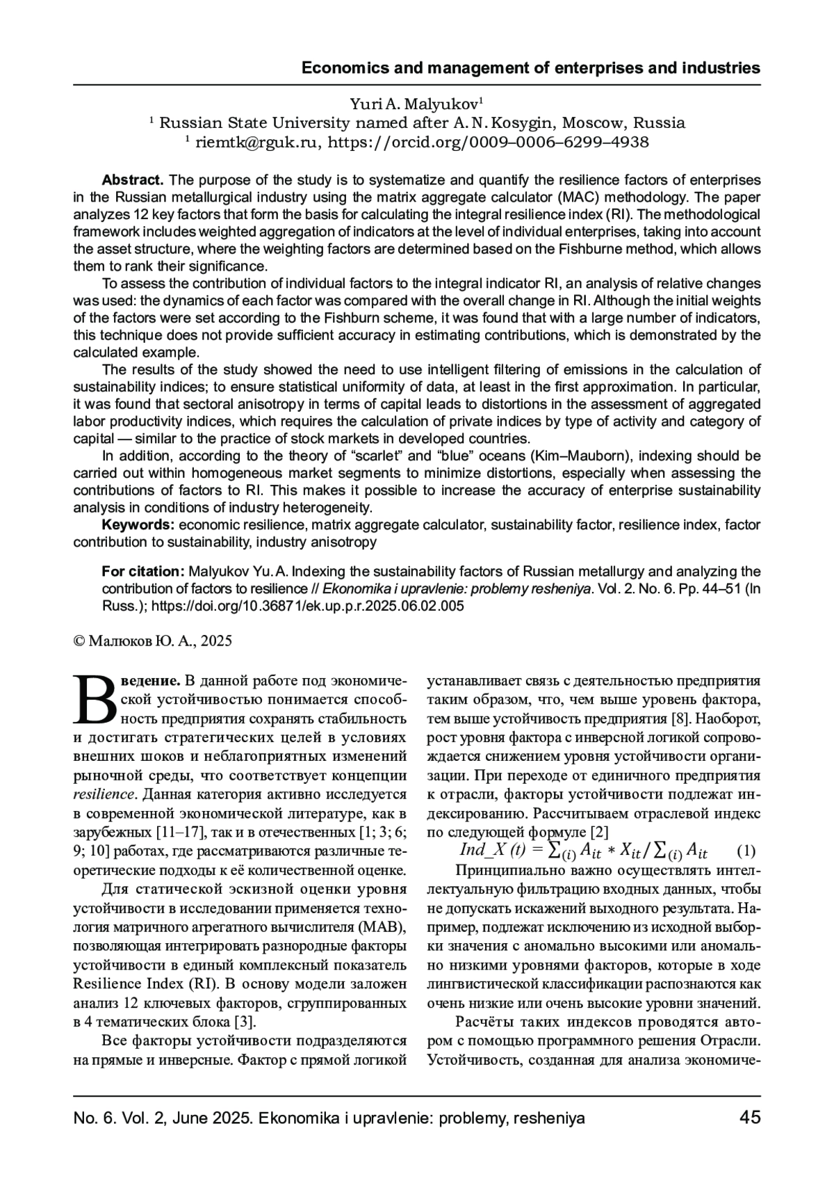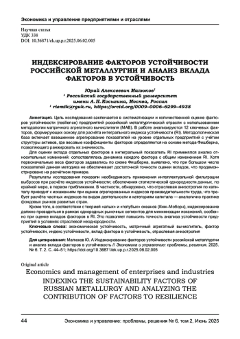 МАЛЮКОВ Ю. А. ИНДЕКСИРОВАНИЕ ФАКТОРОВ УСТОЙЧИВОСТИ РОССИЙСКОЙ МЕТАЛЛУРГИИ И АНАЛИЗ ВКЛАДА ФАКТОРОВ В УСТОЙЧИВОСТЬ // ЭКОНОМИКА И УПРАВЛЕНИЕ: ПРОБЛЕМЫ, РЕШЕНИЯ. 2025. ТОМ 2 № 6