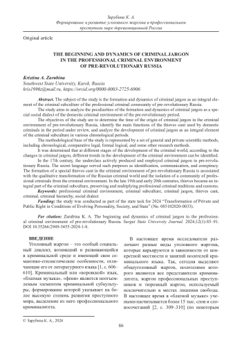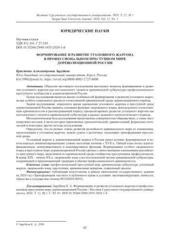 Объектом настоящего исследования выступают вопросы формирования и развития уголовного жаргона как неотъемлемого элемента криминальной субкультуры профессионального преступного сообщества в дореволюционной России. Целью исследования является анализ особенностей формирования и развития уголовного жаргона как особого социального диалекта отечественной криминальной среды дореволюционного периода. Задачи исследования: определить время зарождения уголовного жаргона в преступной среде дореволюционной России; выявить основные функции «воровского» языка, используемого отечественным криминалитетом в рассматриваемый период; проанализировать развитие уголовного жаргона как неотъемлемого элемента криминальной субкультуры в рамках заданного хронологического периода. Методологическая база исследования представлена совокупностью общенаучных, а также частнонаучных методов, в числе которых применялись хронологический, сравнительный, формально-логический и некоторые другие методы исследования. Определено, что на разных этапах развития российского криминального мира по изменениям, происходящим в уголовном жаргоне, можно судить о различных тенденциях трансформации преступной среды. Уголовный жаргон в дореволюционный период в России начал активно формироваться и использоваться люмпенизированными слоями населения начиная с XVII в. Тайный язык носил идентификационную, коммуникативную и конспиративную функции. Формирование особого «воровского» языка в преступном мире дореволюционной России связано с качественными изменениями российского преступного мира, выделением из криминальной среды сообщества преступников-профессионалов. В конце XIX – начале XX в. «воровской» язык стал неотъемлемой частью криминальной субкультуры, сохраняющей и преумножающей традиции и обычаи профессионального криминалитета.
