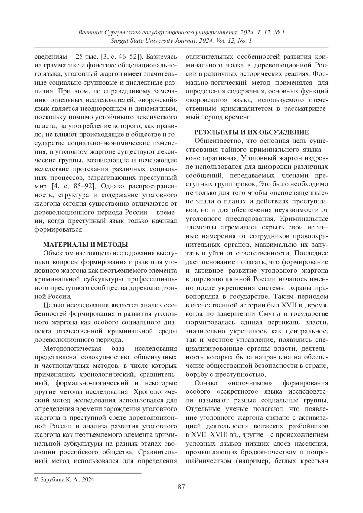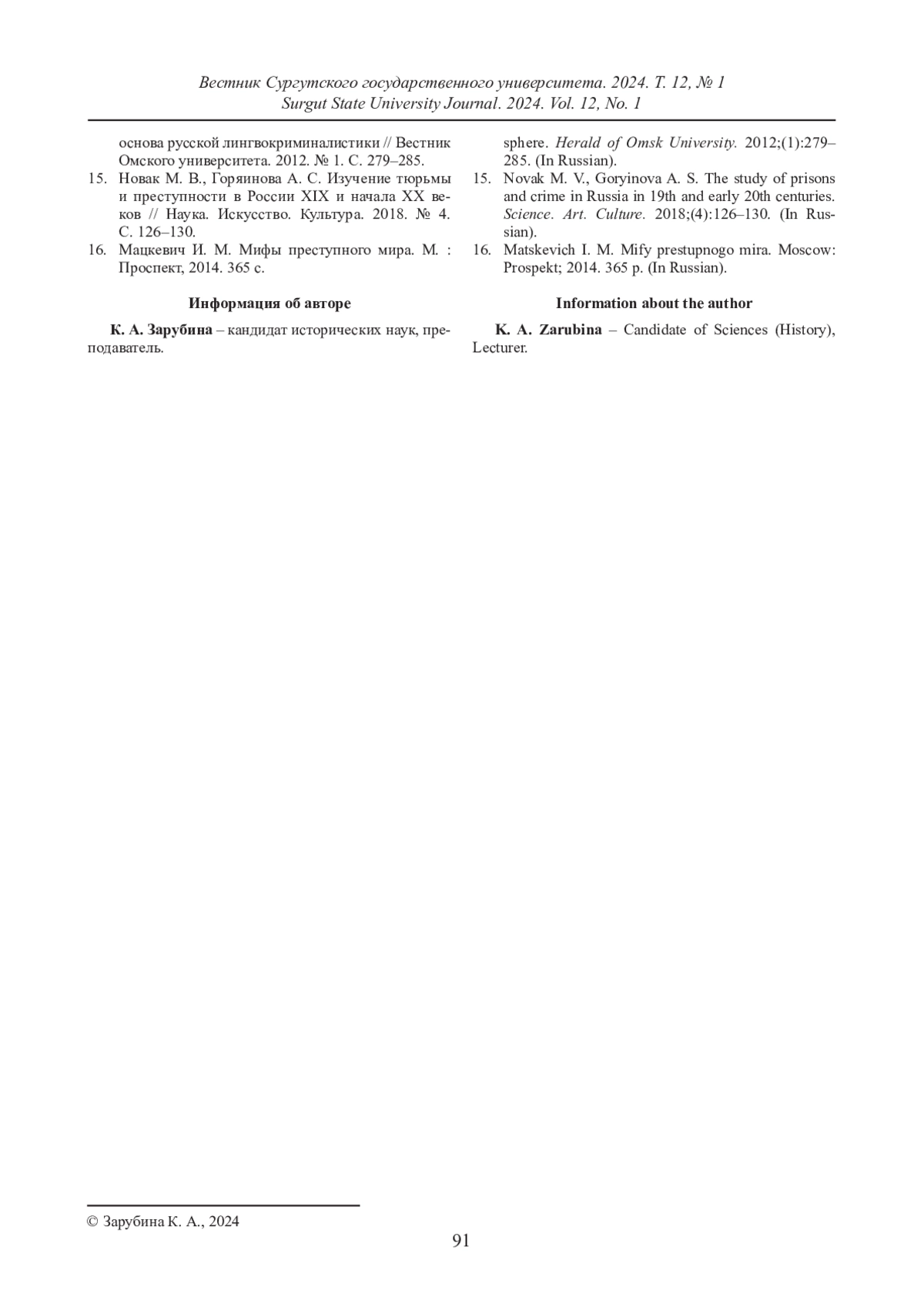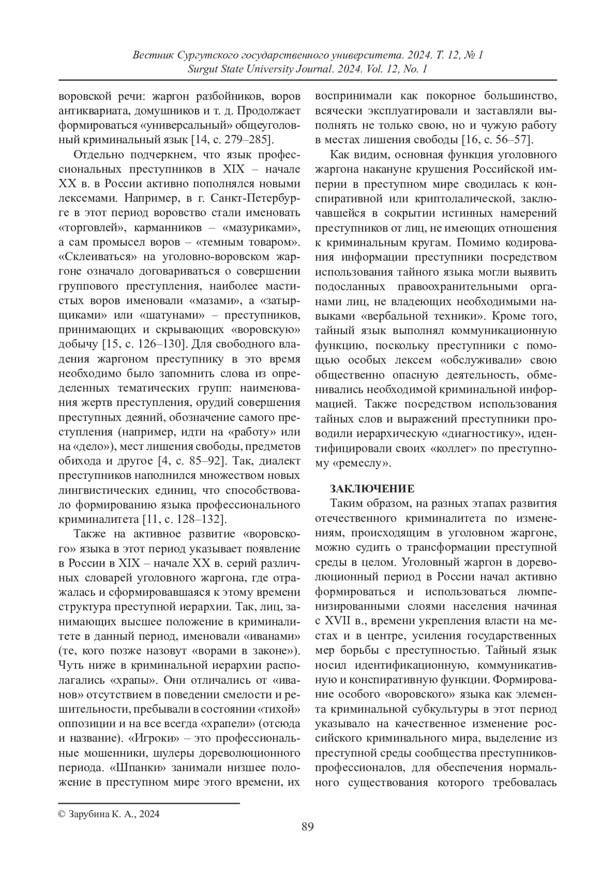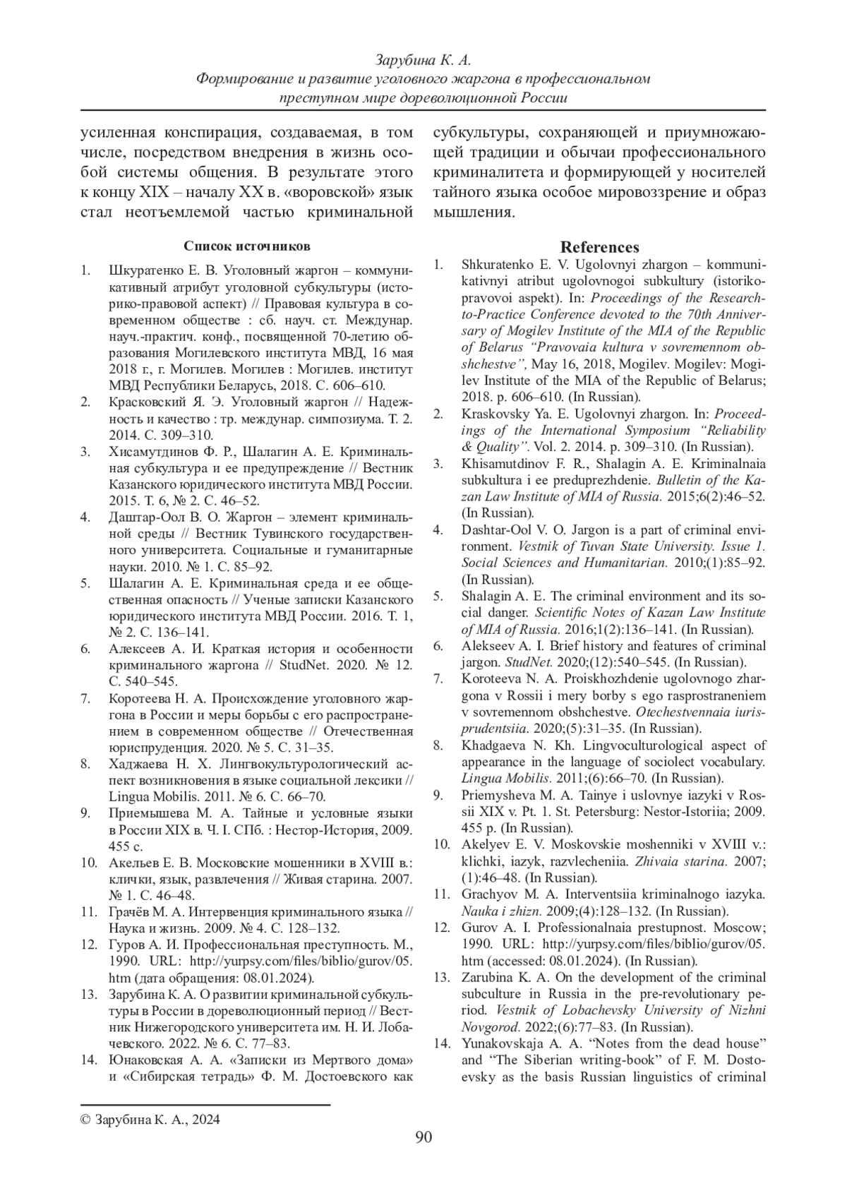 13. Зарубина К. А. О развитии криминальной субкультуры в России в дореволюционный период // Вестник Нижегородского университета им. Н. И. Лобачевского. 2022. № 6. С. 77-83.