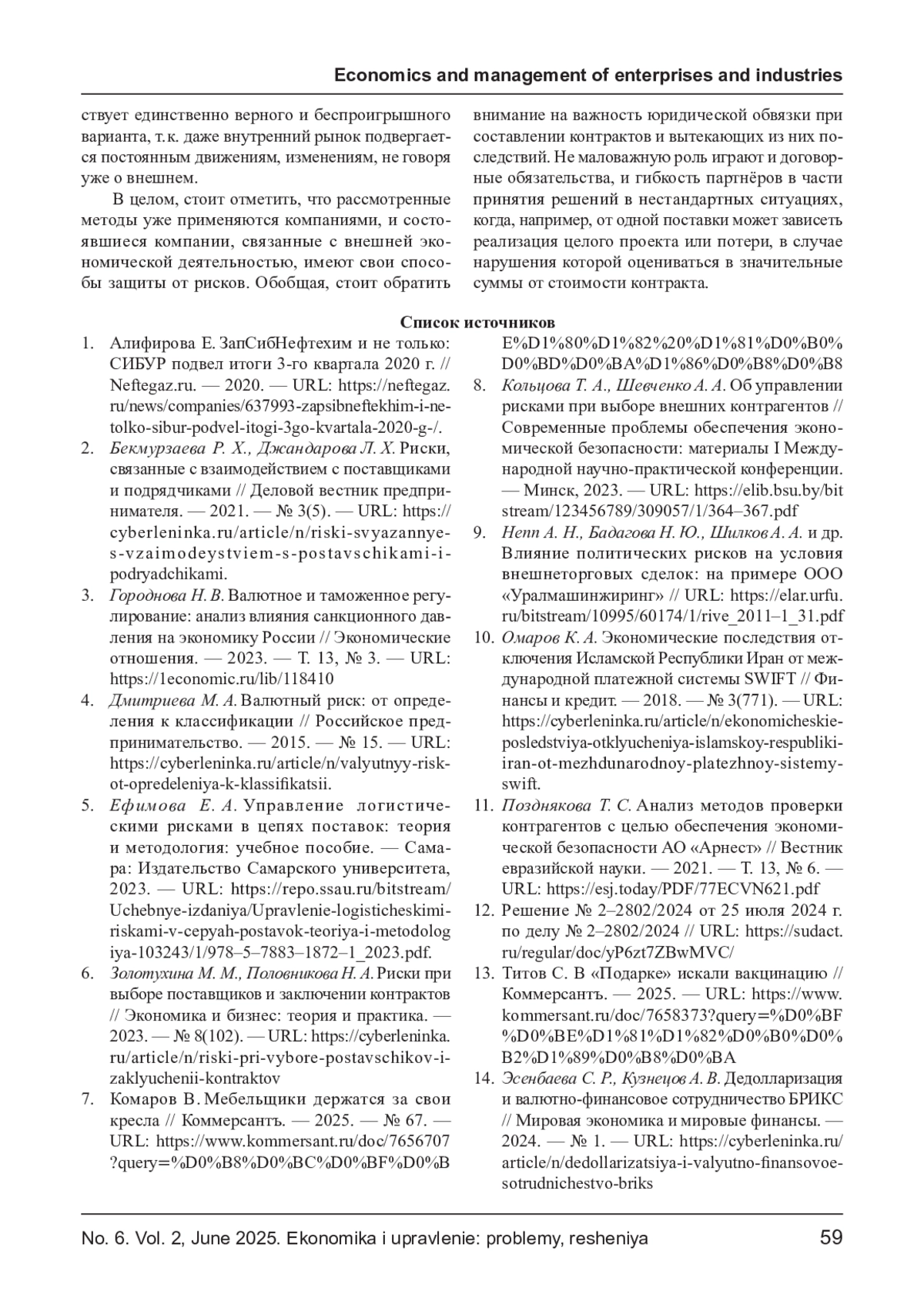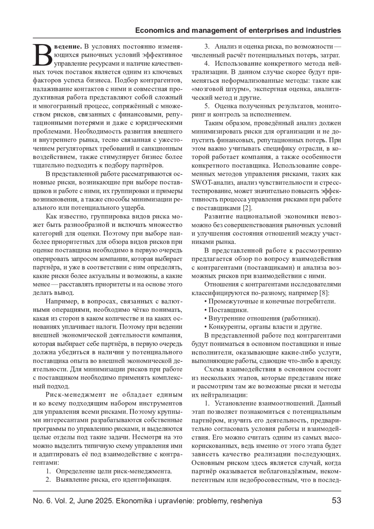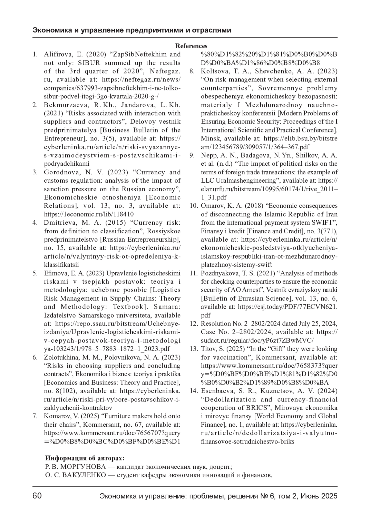 МОРГУНОВА Р. В., ВАКУЛЕНКО О. С. РИСКИ ФИРМЫ ПРИ ВЗАИМОДЕЙСТВИИ С ПОСТАВЩИКАМИ // ЭКОНОМИКА И УПРАВЛЕНИЕ: ПРОБЛЕМЫ, РЕШЕНИЯ. 2025. ТОМ 2 № 6