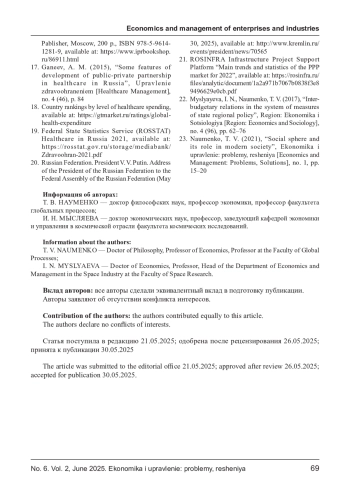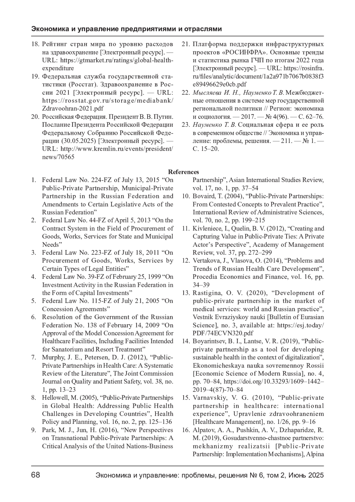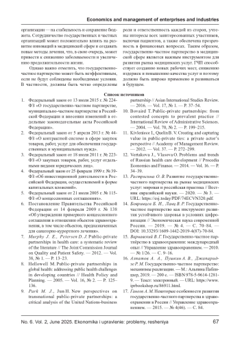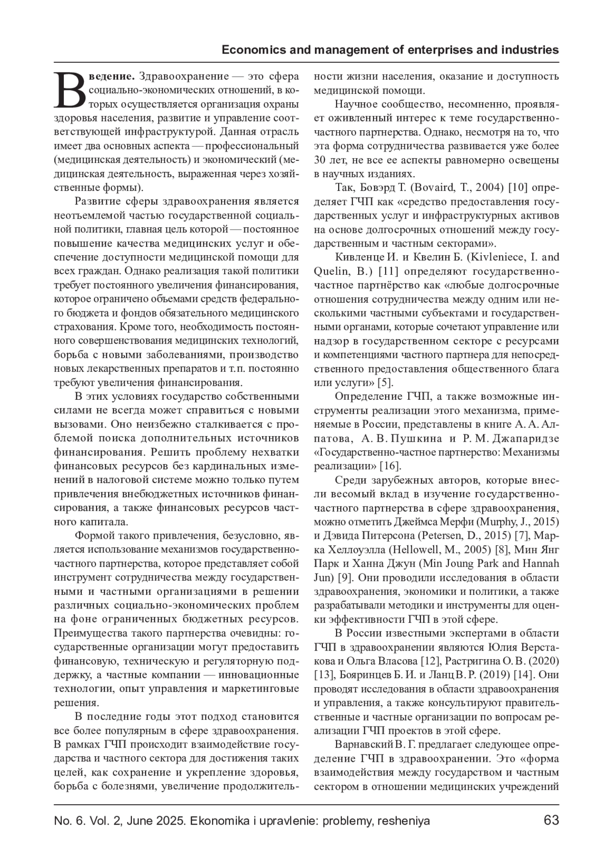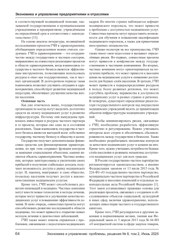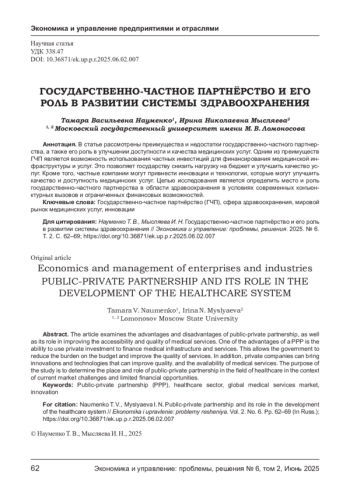 НАУМЕНКО Т. В., МЫСЛЯЕВА И. Н. ГОСУДАРСТВЕННО-ЧАСТНОЕ ПАРТНЁРСТВО И ЕГО РОЛЬ В РАЗВИТИИ СИСТЕМЫ ЗДРАВООХРАНЕНИЯ // ЭКОНОМИКА И УПРАВЛЕНИЕ: ПРОБЛЕМЫ, РЕШЕНИЯ. 2025. ТОМ 2 № 6