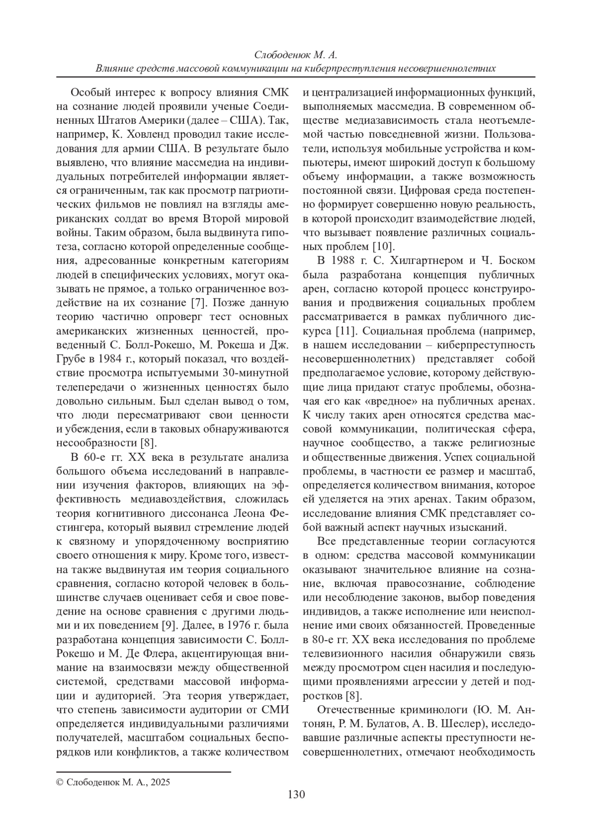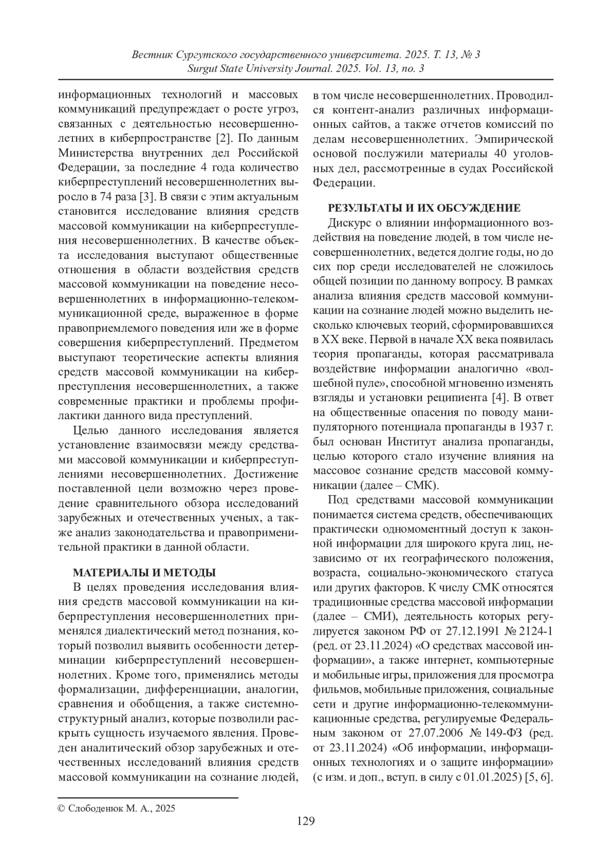 СЛОБОДЕНЮК М. А. ВЛИЯНИЕ СРЕДСТВ МАССОВОЙ КОММУНИКАЦИИ НА КИБЕРПРЕСТУПЛЕНИЯ НЕСОВЕРШЕННОЛЕТНИХ // ВЕСТНИК СУРГУТСКОГО ГОСУДАРСТВЕННОГО УНИВЕРСИТЕТА. 2025. ТОМ 13, № 1