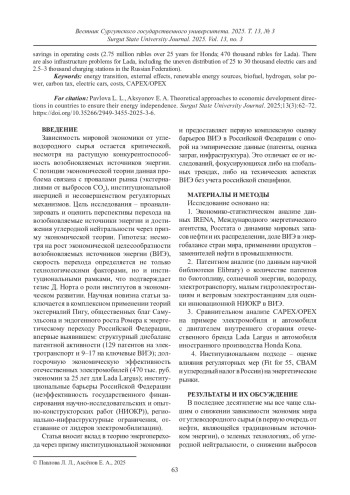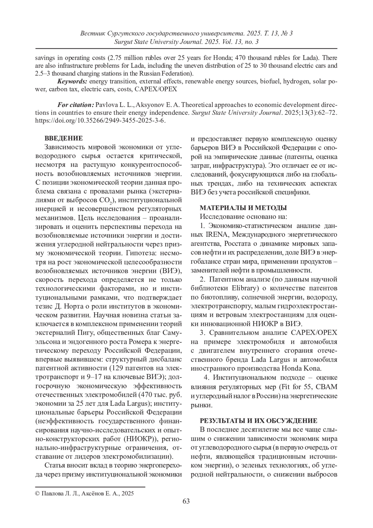 В статье исследуются теоретические и практические аспекты глобального энергетического перехода от углеводородной зависимости к возобновляемым источникам энергии с акцентом на институциональные и экономические барьеры. Особое внимание уделяется институциональным факторам: роль углеродного налога (в том числе CBAM ЕС и пилотный эксперимент на острове Сахалин в Российской Федерации) в коррекции рыночных провалов (экстерналии CO2), необходимости государственного финансирования научно-исследовательских и опытно-конструкторских работ по возобновляемым источникам энергии (теория общественных благ, теория внешних эффектов А. Пигу, эндогенный рост П. Ромера). Анализ патентной активности Российской Федерации выявил дисбаланс (129 и 90 патентов на электротранспорт и биотопливо и лишь 17, 15, 9, 9 на возобновляемые источники энергии, солнечные электростанции, ветряные электростанции, малые гидроэлектростанции соответственно) и технологическое отставание. Проведенный сравнительный анализ CAPEX/OPEX для электромобилей (Honda Kona, Lada Largus) и автомобилей с двигателями внутреннего сгорания подтверждают долгосрочную экономию эксплуатационных затрат (2,75 млн руб. за 25 лет для Honda; 470 тыс. руб. для Lada и инфраструктурные проблемы, среди которых неравномерное распределение 25–30 тыс. электромобилей и 2,5–3 тыс. зарядных станций по Российской Федерации)