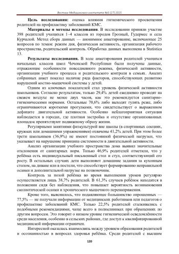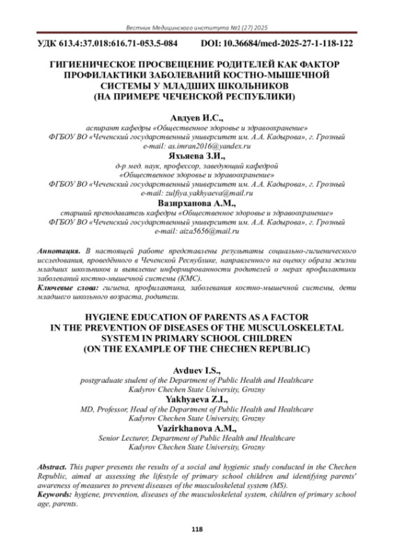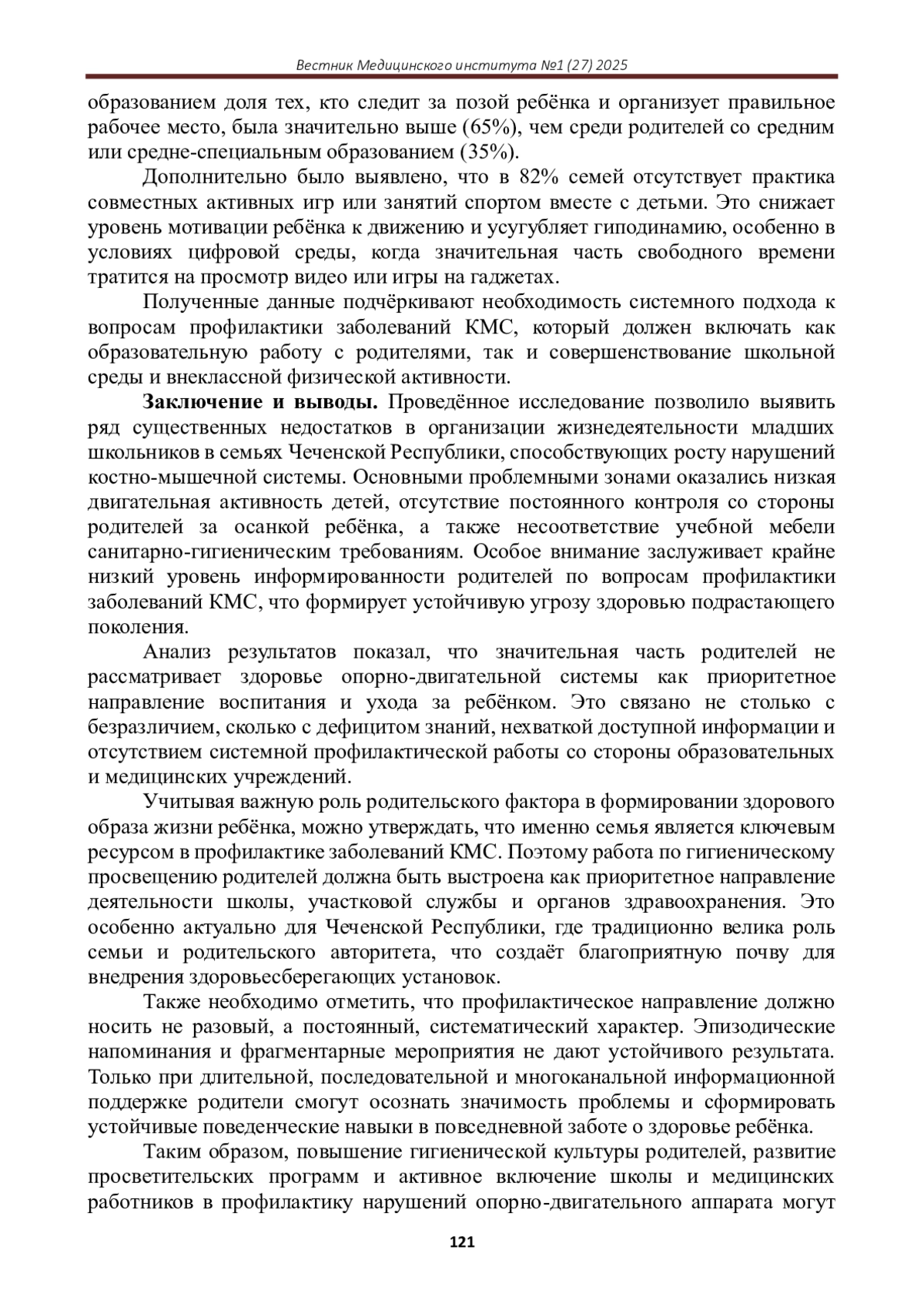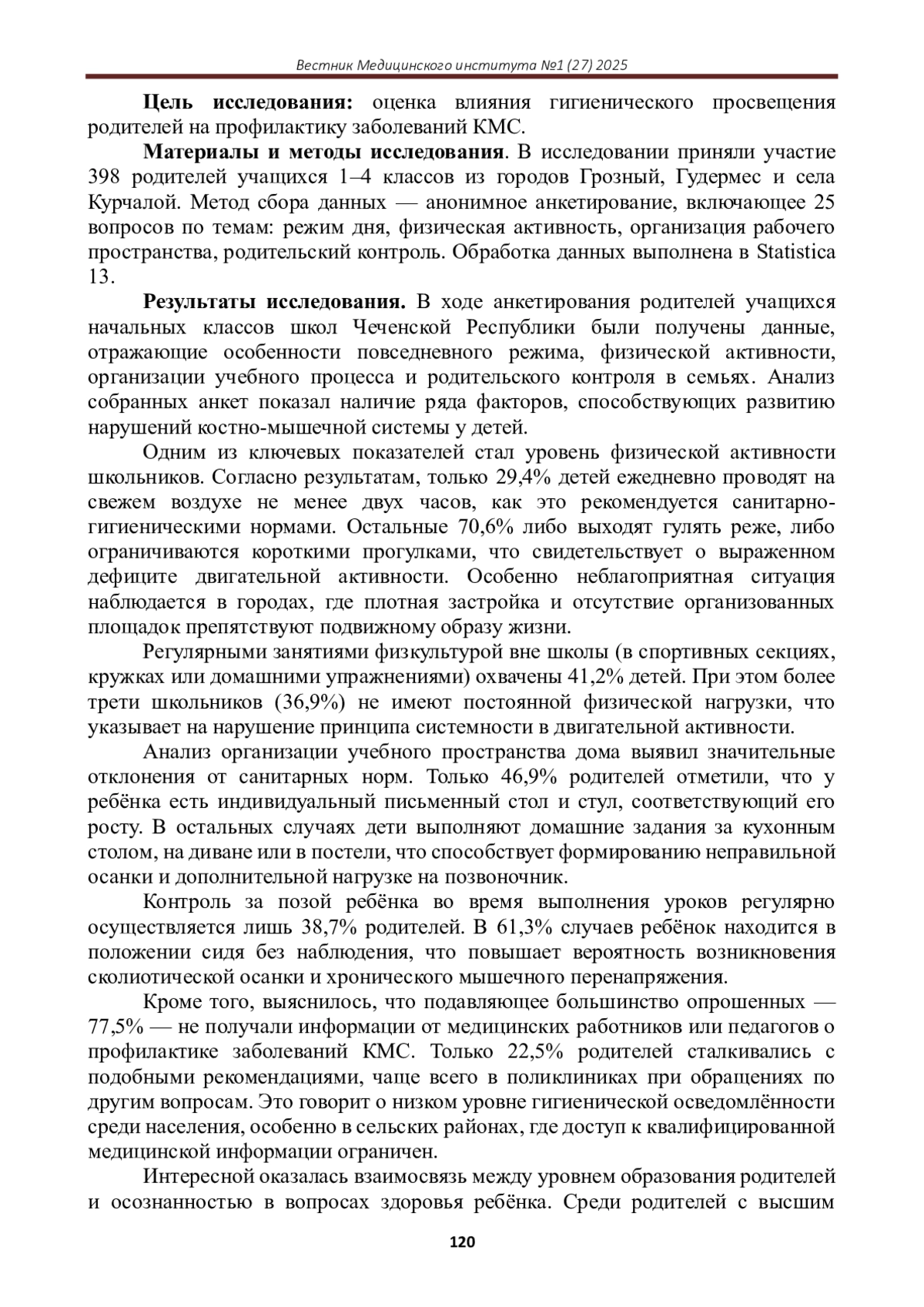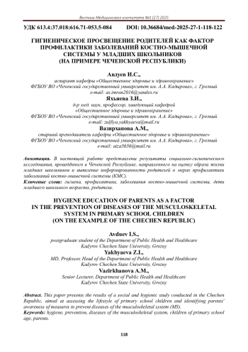 В настоящей работе представлены результаты социально-гигиенического исследования, проведённого в Чеченской Республике, направленного на оценку образа жизни младших школьников и выявление информированности родителей о мерах профилактики заболеваний костно-мышечной системы (КМС).