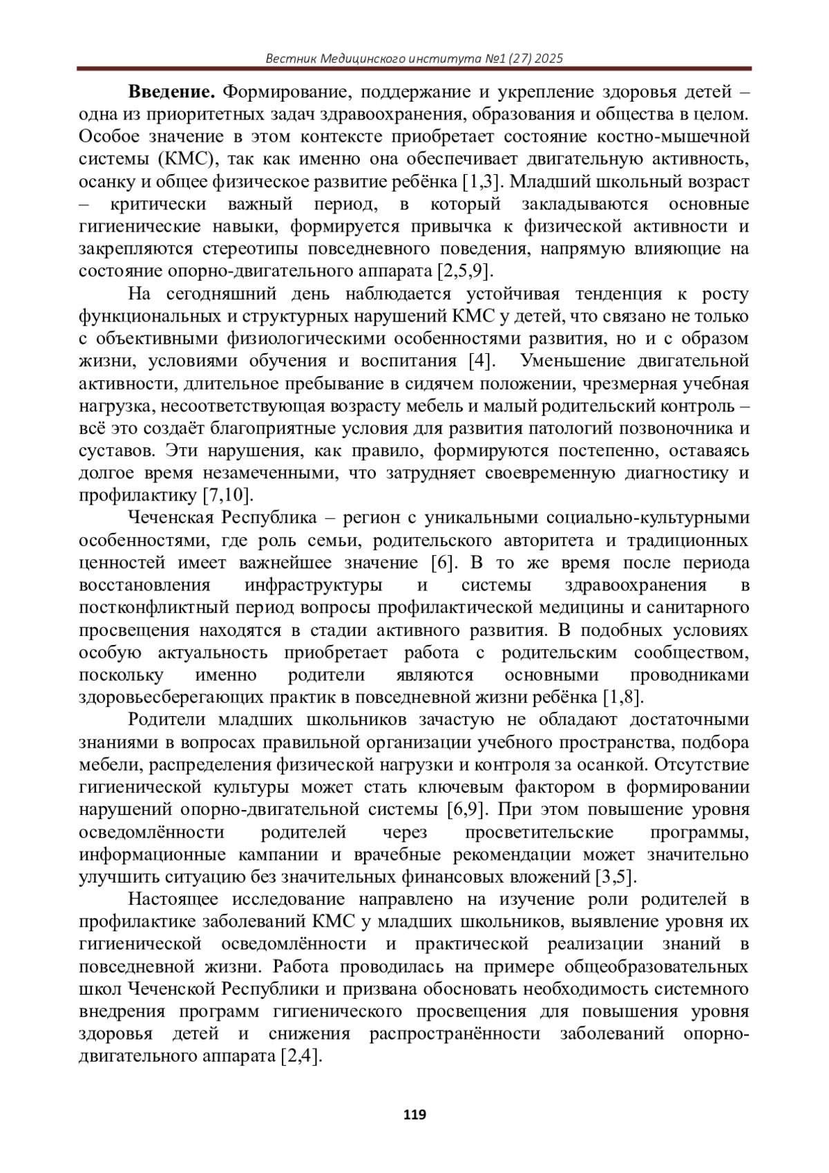 Формирование, поддержание и укрепление здоровья детей – одна из приоритетных задач здравоохранения, образования и общества в целом. Особое значение в этом контексте приобретает состояние костно-мышечной системы (КМС), так как именно она обеспечивает двигательную активность, осанку и общее физическое развитие ребёнка [1,3]. Младший школьный возраст – критически важный период, в который закладываются основные гигиенические навыки, формируется привычка к физической активности и закрепляются стереотипы повседневного поведения, напрямую влияющие на состояние опорно-двигательного аппарата [2,5,9].