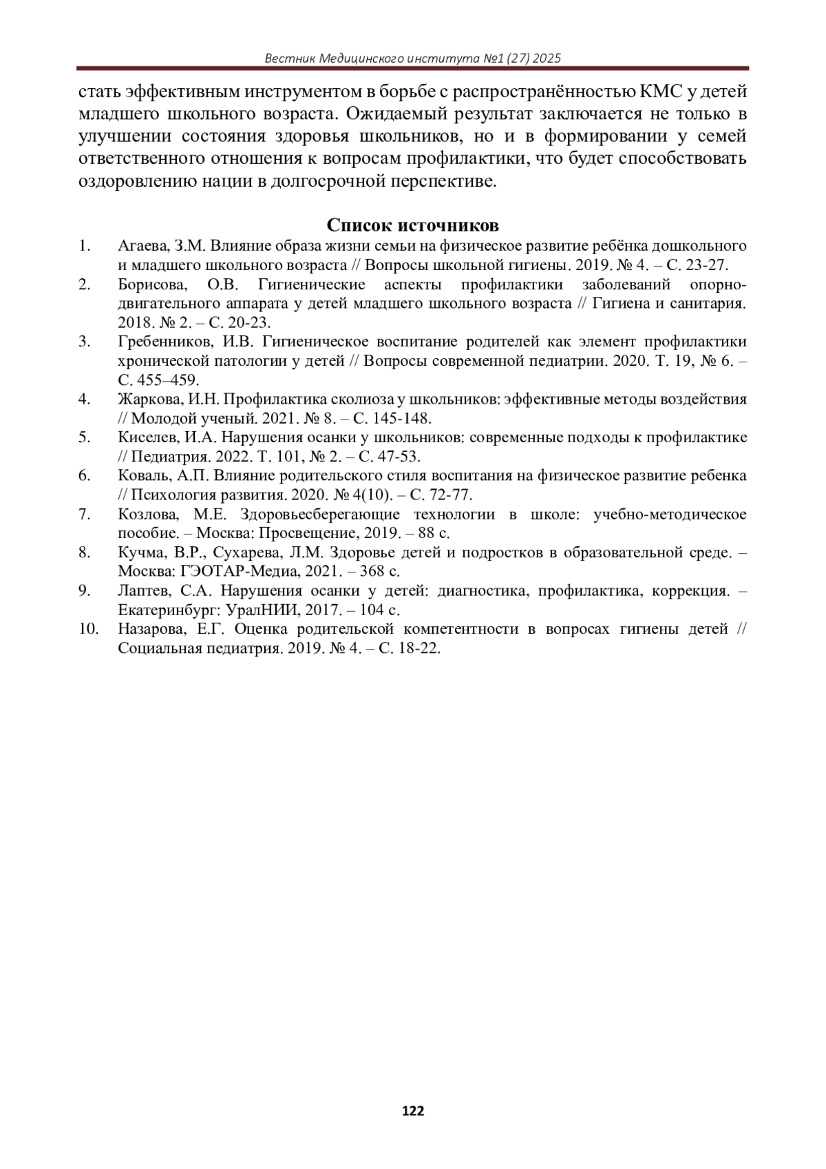 5. Киселев, И.А. Нарушения осанки у школьников: современные подходы к профилактике // Педиатрия. 2022. Т. 101, № 2. - С. 47-53.