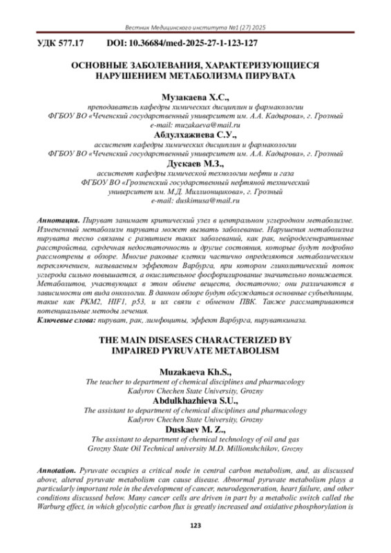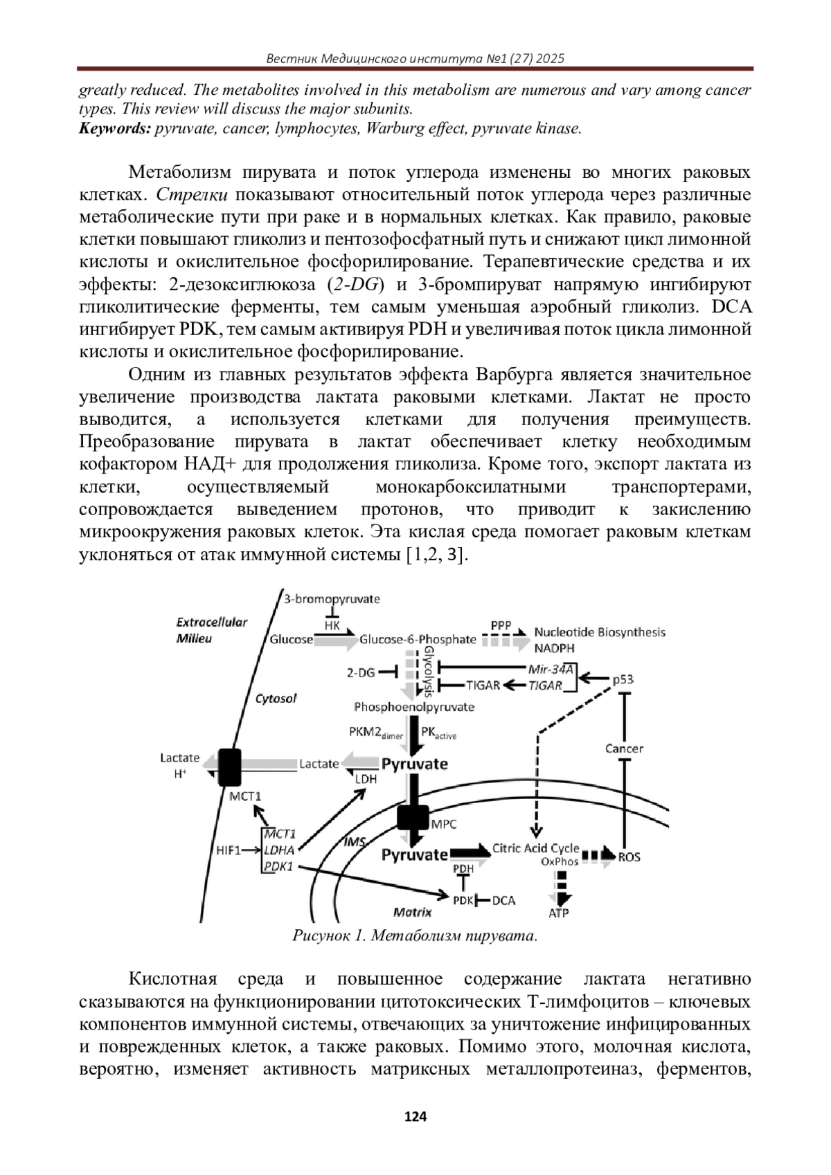 Пируват занимает критический узел в центральном углеродном метаболизме. Измененный метаболизм пирувата может вызвать заболевание. Нарушения метаболизма пирувата тесно связаны с развитием таких заболеваний, как рак, нейродегенеративные расстройства, сердечная недостаточность и другие состояния, которые будут подробно рассмотрены в обзоре. Многие раковые клетки частично определяются метаболическим переключением, называемым эффектом Варбурга, при котором гликолитический поток углерода сильно повышается, а окислительное фосфорилирование значительно понижается. Метаболитов, участвующих в этом обмене веществ, достаточно; они различаются в зависимости от вида онкологии. В данном обзоре будут обсуждаться основные субъединицы, такие как PKM2, HIF1, p53, и их связи с обменом ПВК. Также рассматриваются потенциальные методы лечения.