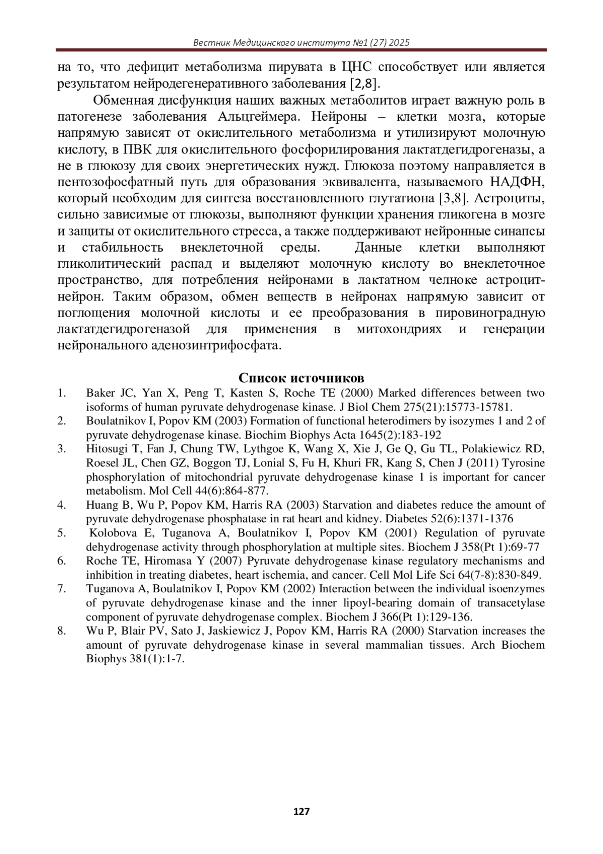 8. Wu P, Blair PV, Sato J, Jaskiewicz J, Popov KM, Harris RA (2000) Starvation increases the amount of pyruvate dehydrogenase kinase in several mammalian tissues. Arch Biochem Biophys 381(1):1-7.