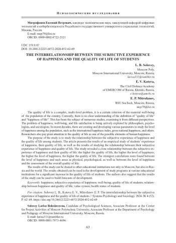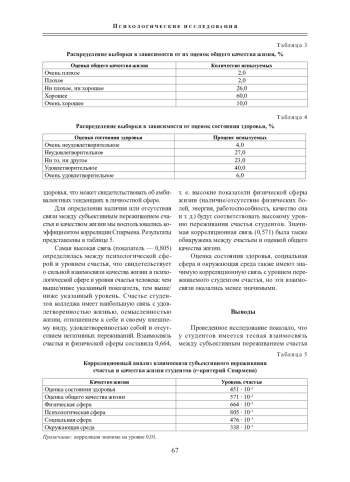 Цель исследования - изучение взаимосвязи субъективного переживания счастья и качества жизни студентов. В статье приводятся результаты эмпирического исследования переживания счастья студентами, их качества жизни, а также результаты изучения взаимосвязи их субъективного переживания счастья и качества жизни. Исследование выявило тесную взаимосвязь между субъективным переживанием счастья и качеством жизни: чем выше качество жизни, тем выше уровень счастья; чем выше уровень счастья, тем выше качество жизни. Наиболее сильные корреляции были обнаружены между уровнем ощущения счастья и оценкой общего качества жизни.