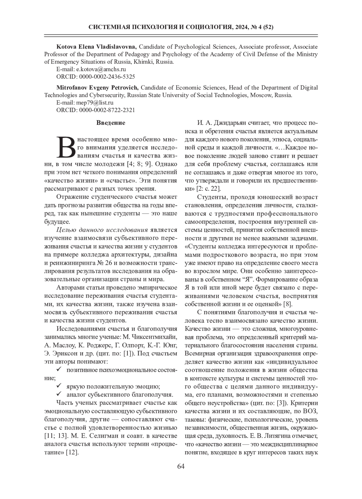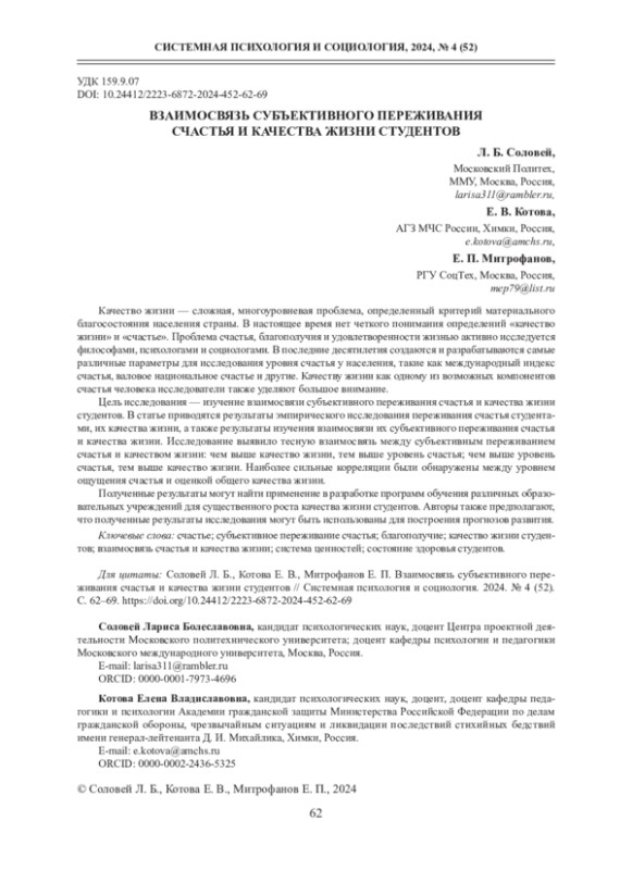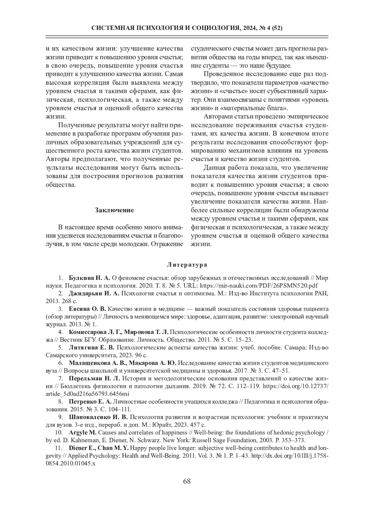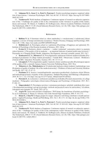 1. Булкина Н. А. О феномене счастья: обзор зарубежных и отечественных исследований // Мир науки. Педагогика и психология. 2020. Т. 8. № 5. URL: https://mir-nauki.com/PDF/26PSMN520.pdf.
