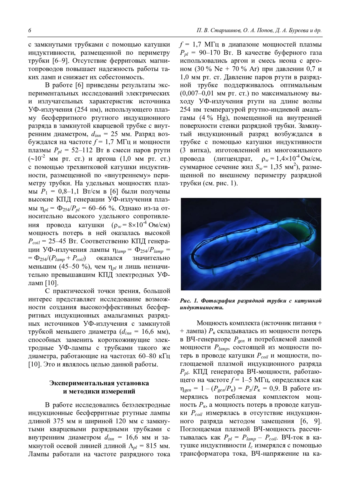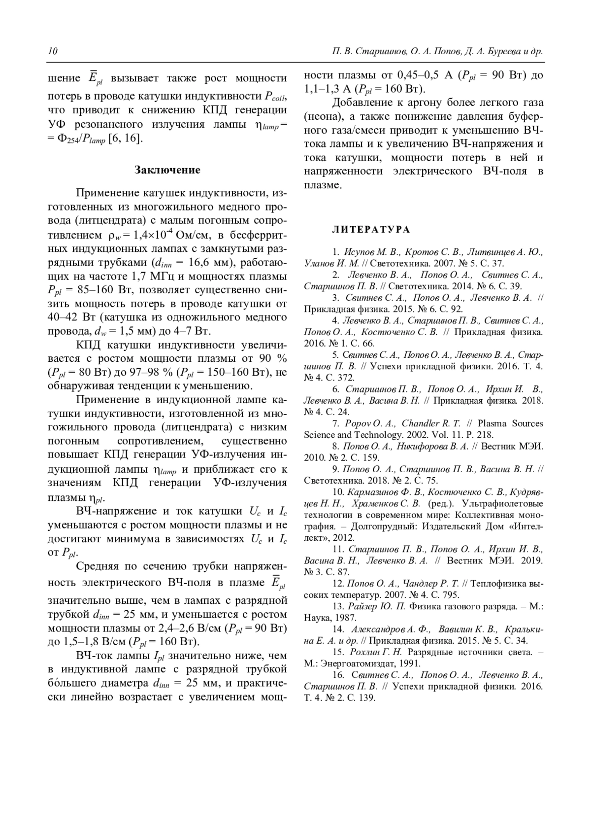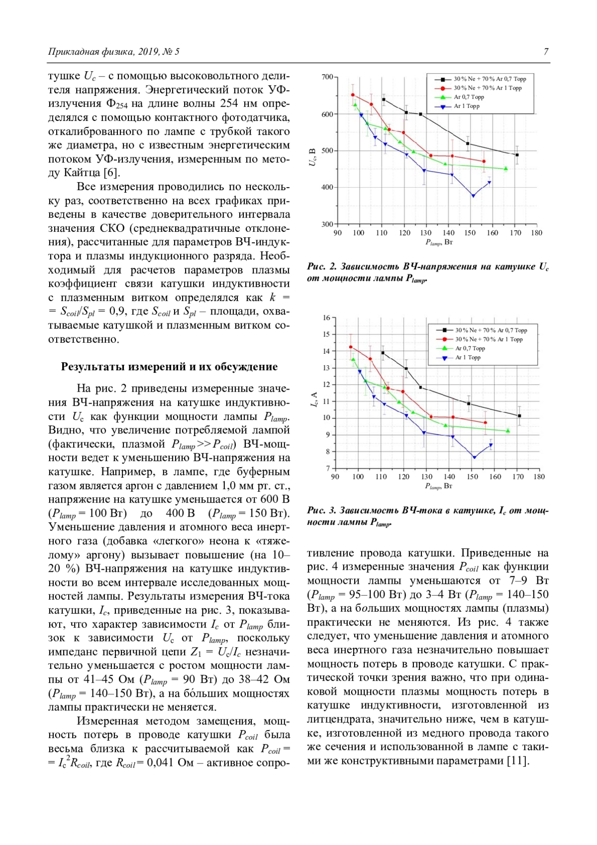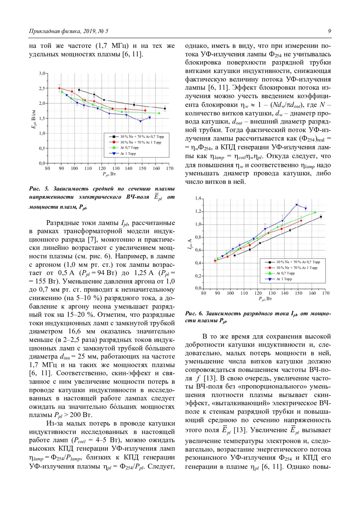 Проведено исследование электрических характеристик плазмы и ВЧ-индуктора бесферритных индукционных разрядов в лампах длиной 375 мм и шириной 120 мм, образованных замкнутой кварцевой трубкой с внутренним диаметром 16,6 мм. Разряд возбуждался на частоте 1,7 МГц и мощностях 90–170 Вт в смеси паров ртути давлением 710-3 мм рт. ст. с инертным газом (Ar, 30 % Ne + 70 % Ar) давлением 0,7 и 1,0 мм рт. ст. с помощью изготовленной из литцендрата (w = 1,410-4 Ом/см) 3-витковой катушки индуктивности, размещенной по периметру разрядной трубки. Установлено, что с увеличением мощности плазмы ВЧ-напряжение и ток катушки, мощность потерь в ней и средняя по сечению трубки напряженность электрического ВЧ-поля в плазме уменьшаются, а разрядный ток лампы возрастает. Понижение давления инертного газа уменьшает разрядный ток лампы и повышает ВЧ-напряжение и ток катушки, мощность потерь в ней и напряженность электрического поля в плазме.