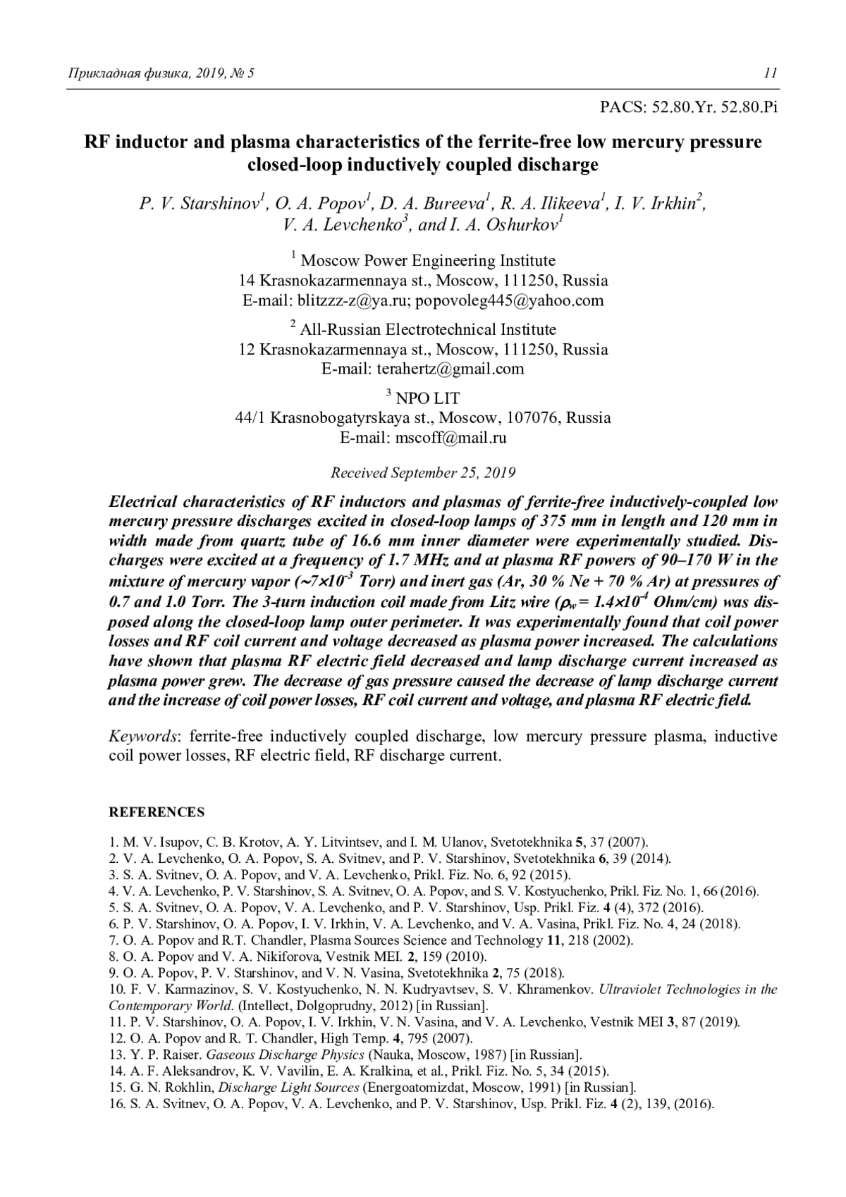 Electrical characteristics of RF inductors and plasmas of ferrite-free inductively-coupled low mercury pressure discharges excited in closed-loop lamps of 375 mm in length and 120 mm in width made from quartz tube of 16.6 mm inner diameter were experimentally studied. Discharges were excited at a frequency of 1.7 MHz and at plasma RF powers of 90–170 W in the mixture of mercury vapor (710-3 Torr) and inert gas (Ar, 30 % Ne + 70 % Ar) at pressures of 0.7 and 1.0 Torr. The 3-turn induction coil made from Litz wire (w = 1.410-4 Оhm/сm) was disposed along the closed-loop lamp outer perimeter. It was experimentally found that coil power losses and RF coil current and voltage decreased as plasma power increased. The calculations have shown that plasma RF electric field decreased and lamp discharge current increased as plasma power grew. The decrease of gas pressure caused the decrease of lamp discharge current and the increase of coil power losses, RF coil current and voltage, and plasma RF electric field.