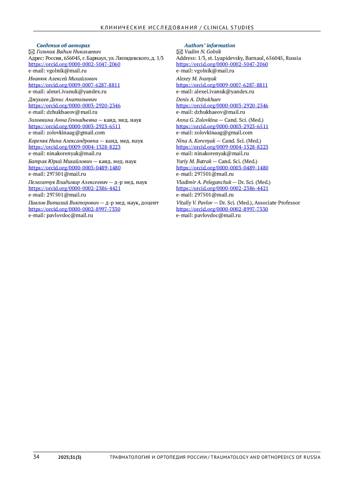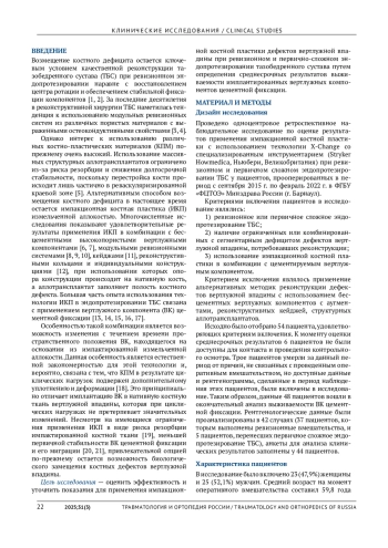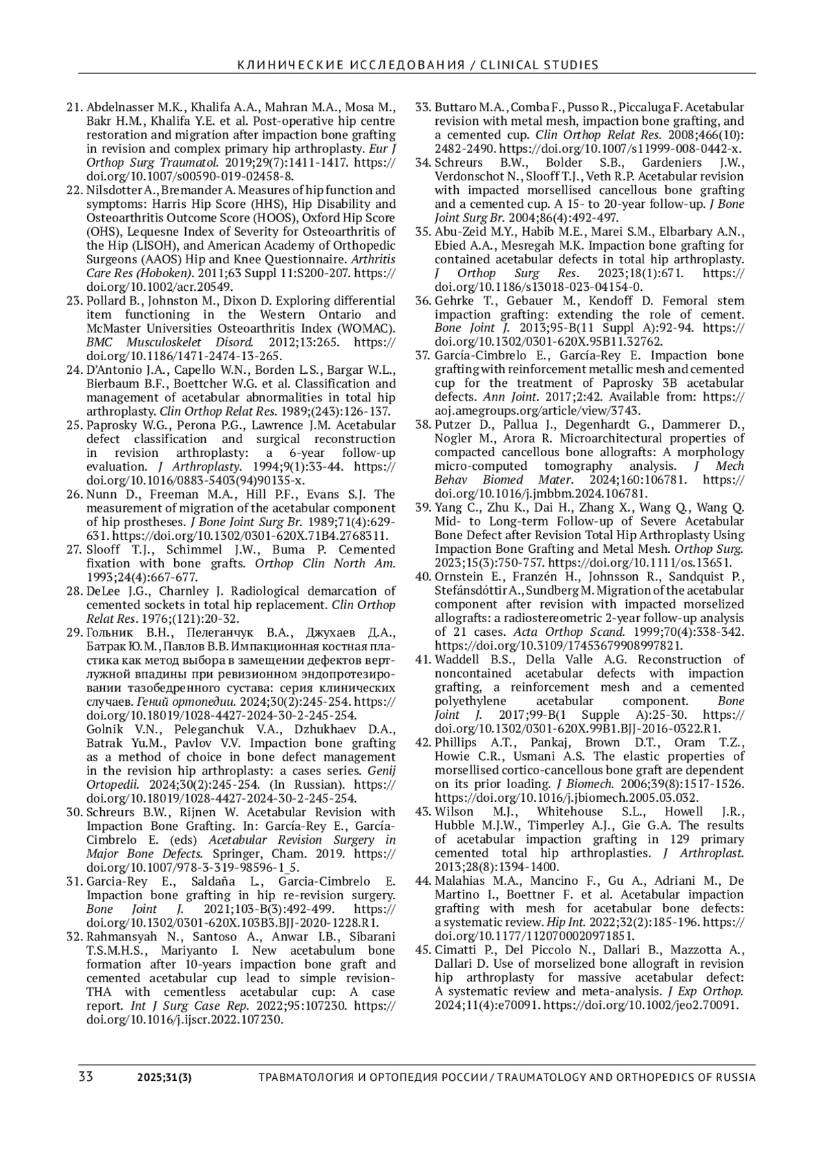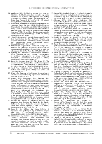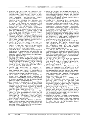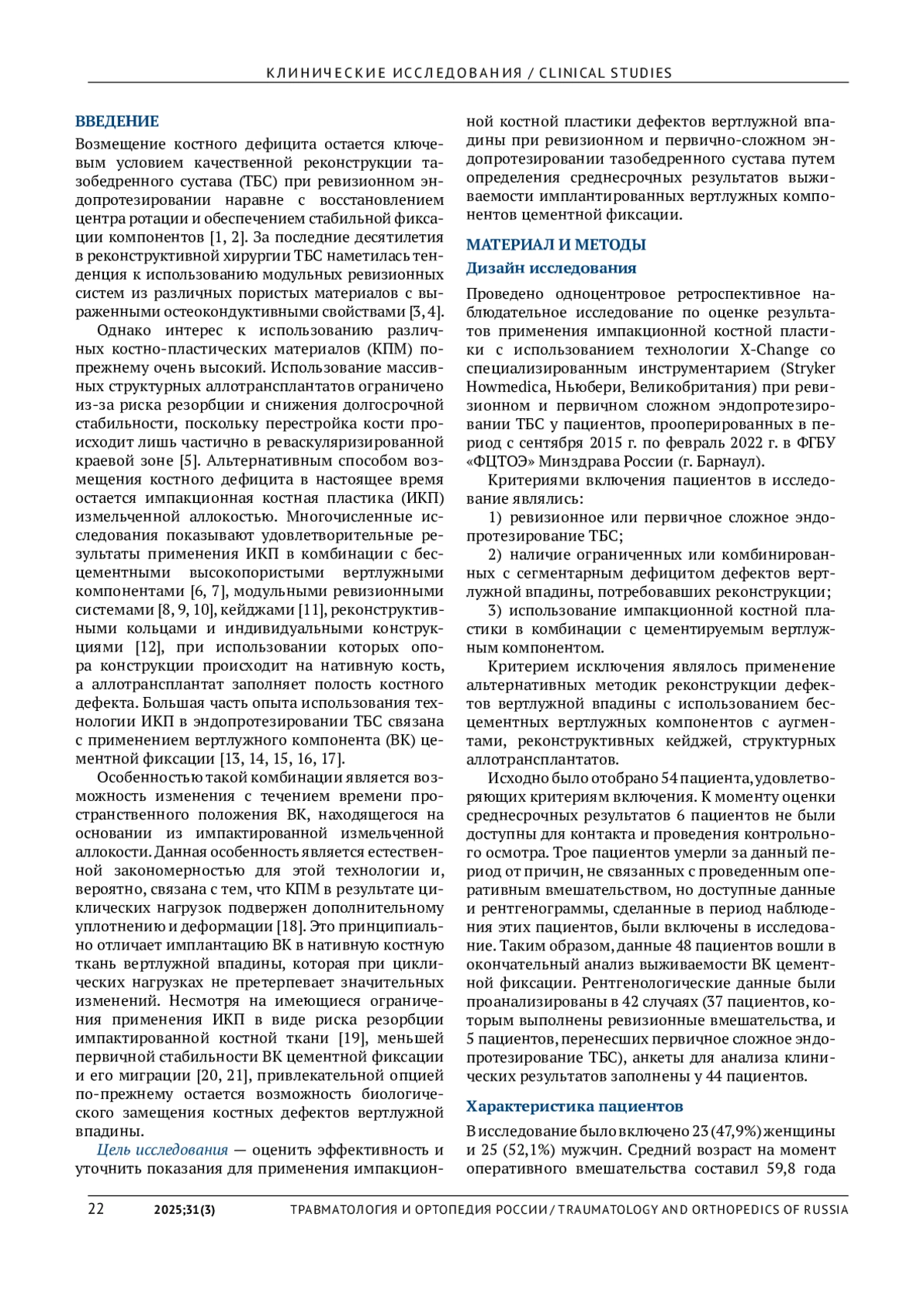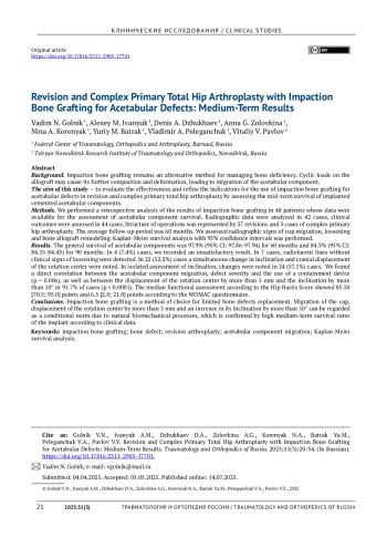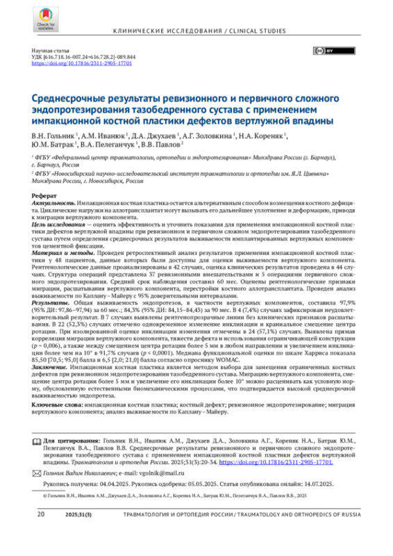 ГОЛЬНИК В. Н., ИВАНЮК А. М., ДЖУХАЕВ Д. А., ЗОЛОВКИНА А. Г., КОРЕНЯК Н. А., БАТРАК Ю. М., ПЕЛЕГАНЧУК В. А., ПАВЛОВ В. В. СРЕДНЕСРОЧНЫЕ РЕЗУЛЬТАТЫ РЕВИЗИОННОГО И ПЕРВИЧНОГО СЛОЖНОГО ЭНДОПРОТЕЗИРОВАНИЯ ТАЗОБЕДРЕННОГО СУСТАВА С ПРИМЕНЕНИЕМ ИМПАКЦИОННОЙ КОСТНОЙ ПЛАСТИКИ ДЕФЕКТОВ ВЕРТЛУЖНОЙ ВПАДИНЫ // ТРАВМАТОЛОГИЯ И ОРТОПЕДИЯ РОССИИ. 2025. № 3, ТОМ 31