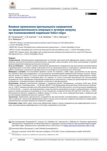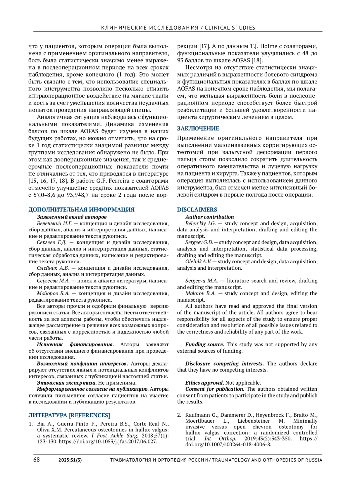 8. Oleinik A.V., Belenkiy I.G., Sergeev G.D., Kochish A.Yu., Razumova K.V., Binazarov A.E. et al. Original Guide for Minimally Invasive Distal Osteotomy of the First Metatarsal Bone in the Treatment of Hallux Valgus. Traumatology and Orthopedics of Russia. 2023;29(3):65-72. DOI: 10.17816/2311-2905-8427