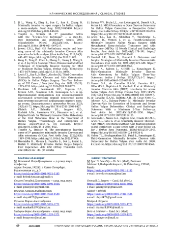 12. Lewis T.L., Lau B., Alkhalfan Y., Trowbridge S., Gordon D., Vernois J. et al. Fourth-Generation Minimally Invasive Hallux Valgus Surgery With Metaphyseal Extra-Articular Transverse and Akin Osteotomy (META): 12 Month Clinical and Radiologic Results. Foot Ankle Int. 2023;44(3):178-191. DOI: 10.1177/10711007231152491